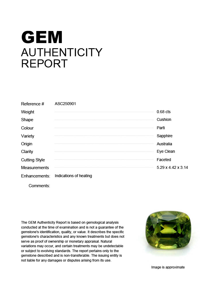 GEM: Stock ID: ASC2509010.68ct Parti Cushion Australia SapphireCarat: 0.68 ctType: SapphireCut: CushionColour: PartiOrigin: AustraliaComment: Heated5.29 x 4.42 x 3.14 mm