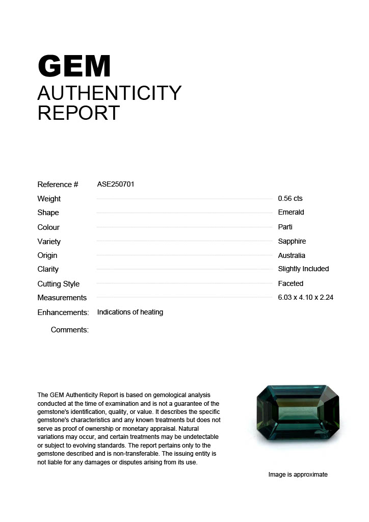 GEM: Stock ID: ASE2505170.80ct Parti Emerald Australia SapphireCarat: 0.80 ctType: SapphireCut: EmeraldColour: PartiOrigin: AustraliaComment: Heated6.31 x 4.37 x 2.75 mm
