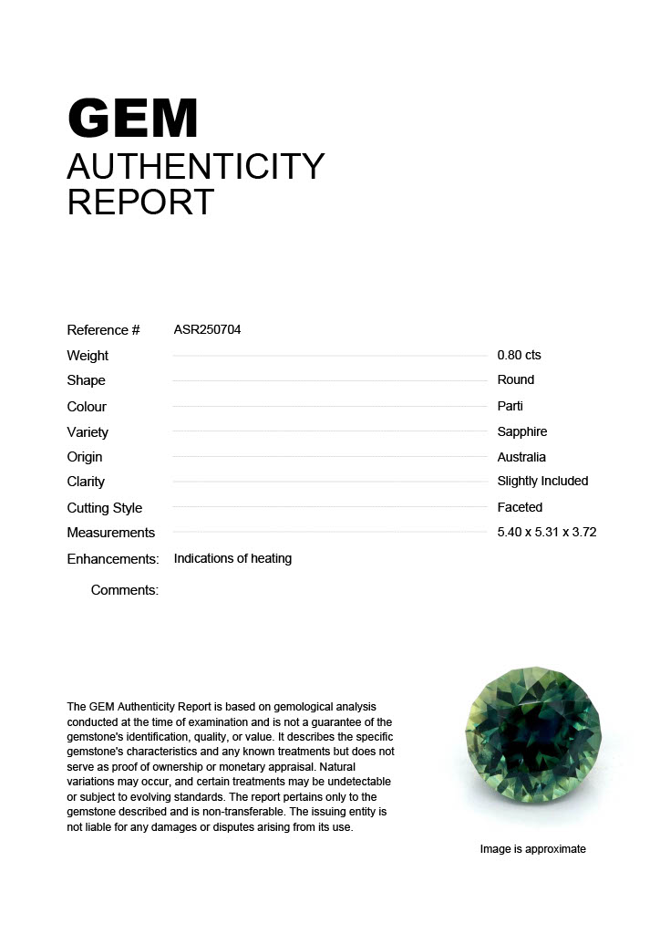 0.80ct Parti Round Australia SapphireCarat: 0.80 ctType: SapphireCut: RoundColour: PartiOrigin: AustraliaComment: Heated5.40 x 5.31 x 3.72 mm
