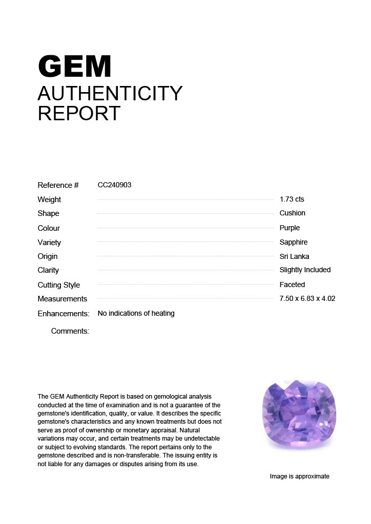 1.73ct Purple Cushion Sri Lanka SapphireCarat: 1.73 ctType: SapphireCut: CushionColour: PurpleOrigin: Sri LankaComment: Not Heated7.50 x 6.83 x 4.02 mm