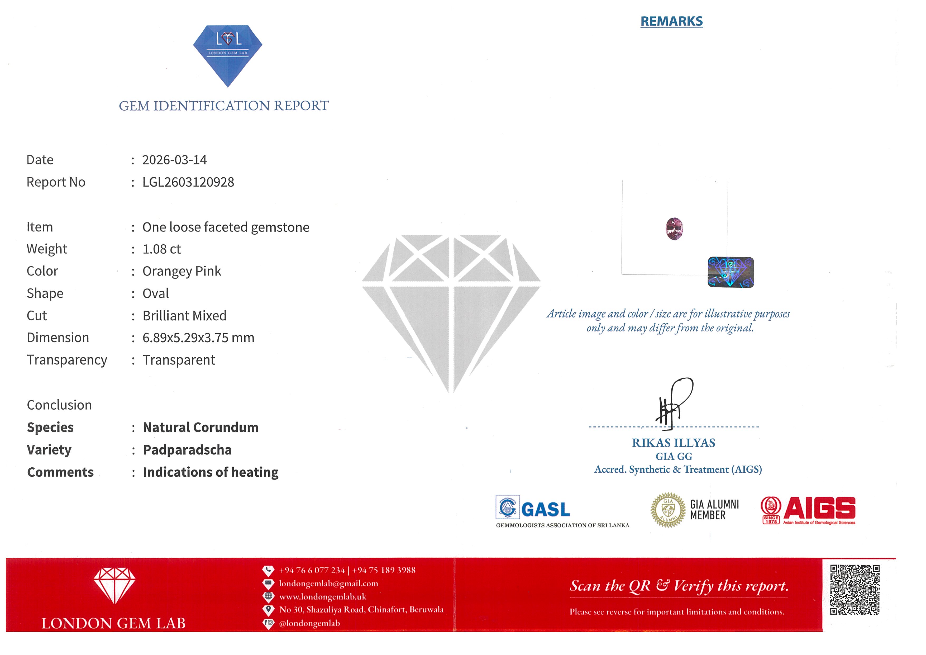 LGL: LGL2603120928 Stock ID: MSV2603151.08ct Padparadscha Oval Madagascar SapphireCarat: 1.08 ctType: SapphireCut: OvalColour: PadparadschaOrigin: MadagascarComment: Heated6.89 x 5.29 x 3.75 mm