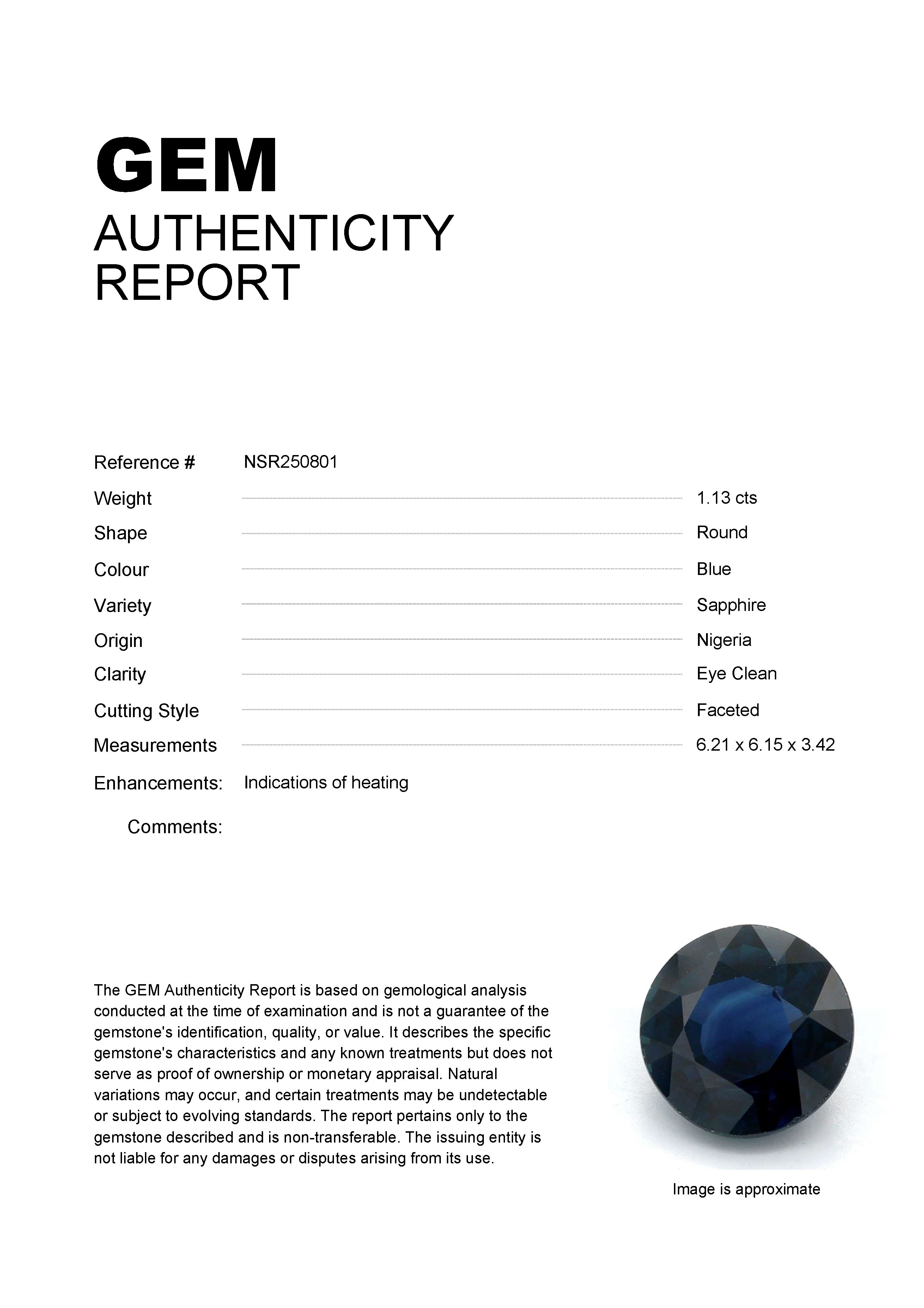 1.13ct Blue Round Nigeria SapphireCarat: 1.13 ctType: SapphireCut: RoundColour: BlueOrigin: NigeriaComment: Heated6.21 x 6.15 x 3.42 mm
