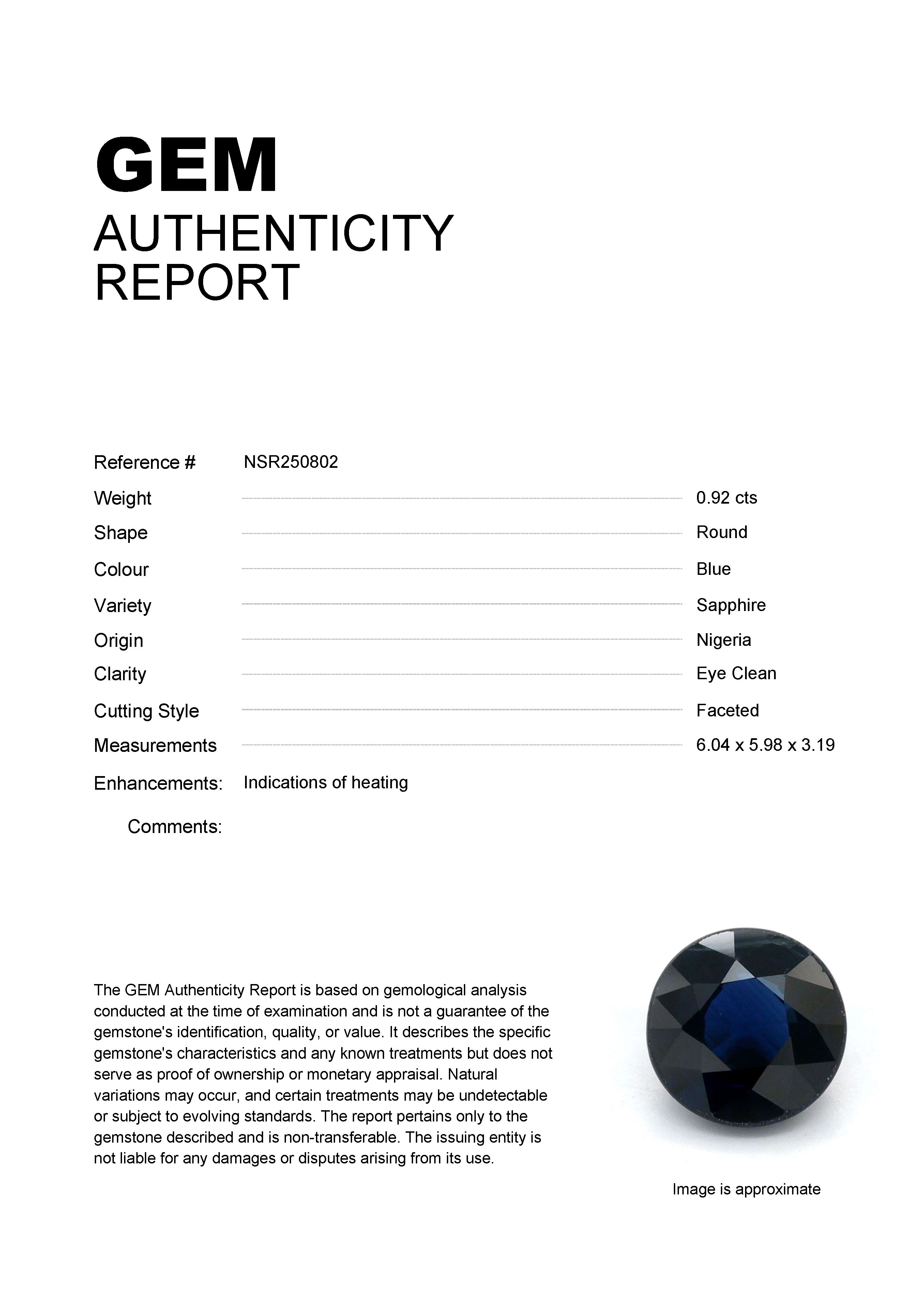 0.92ct Blue Round Nigeria SapphireCarat: 0.92 ctType: SapphireCut: RoundColour: BlueOrigin: NigeriaComment: Heated6.04 x 5.98 x 3.19 mm
