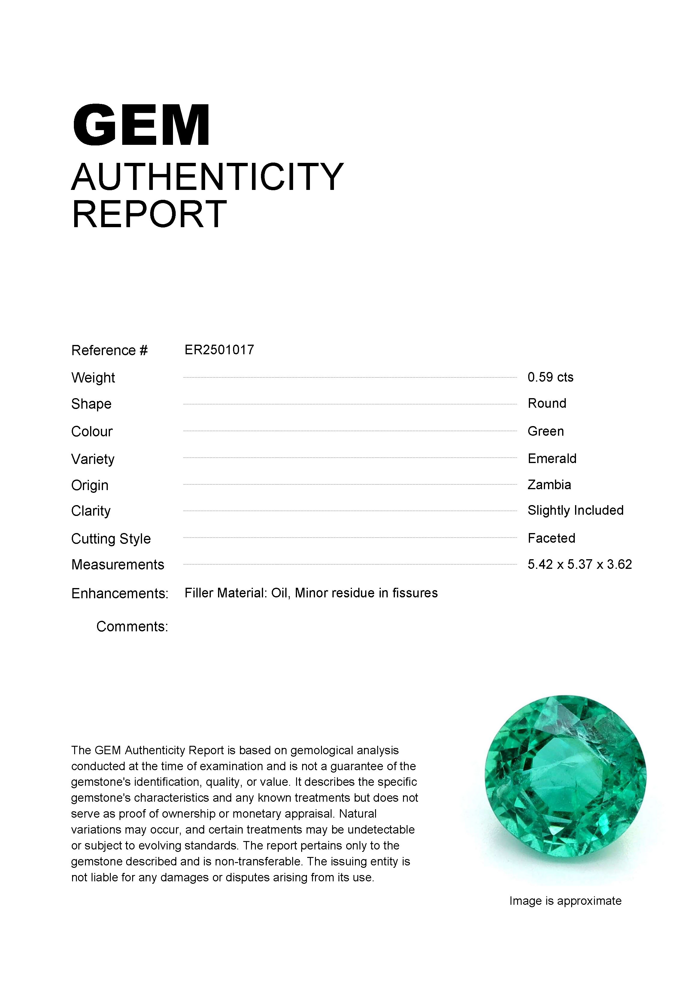 0.59ct Green Round Zambia EmeraldCarat: 0.59 ctType: EmeraldCut: RoundColour: GreenOrigin: ZambiaComment: Not Heated,