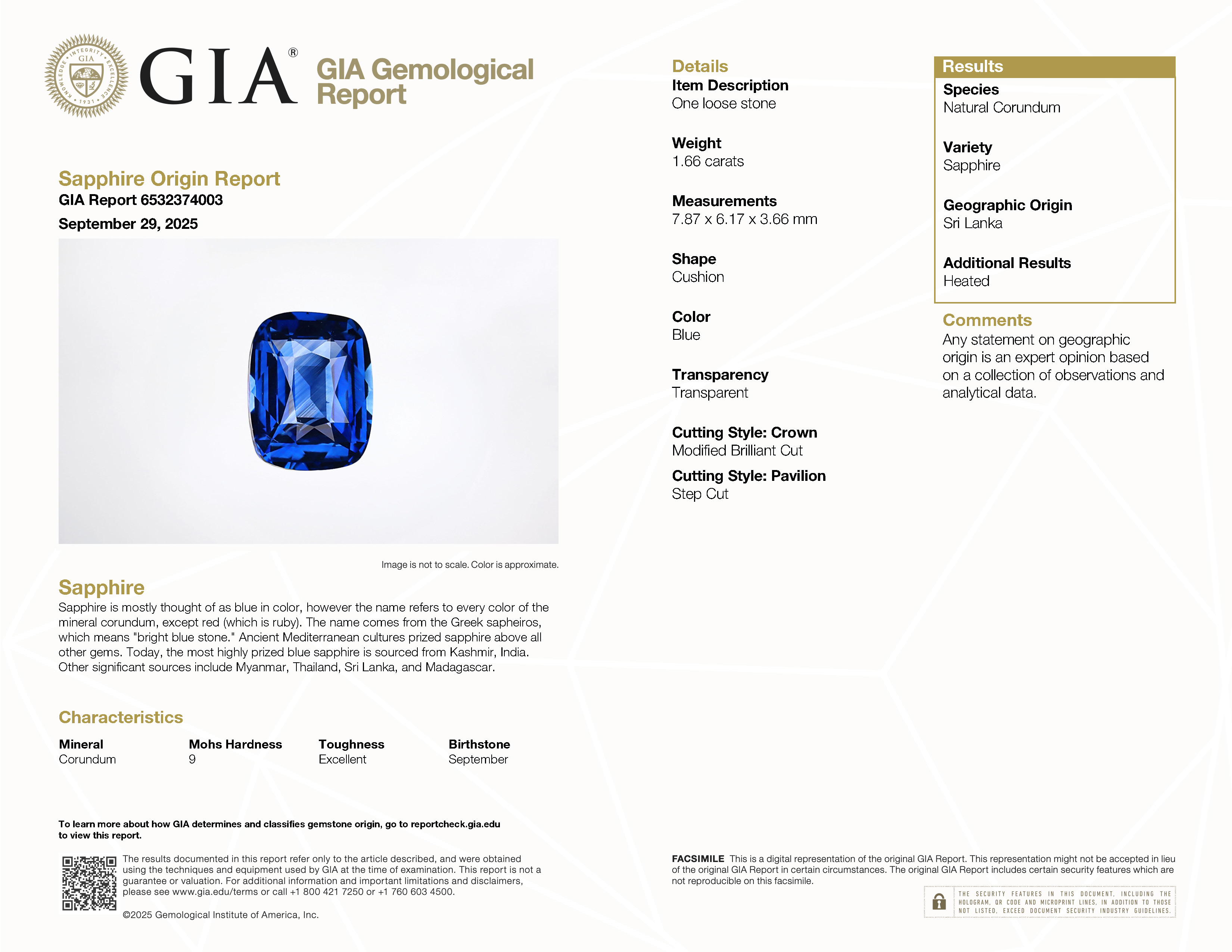 GIA: 6532374003 Stock ID: CC2409161.66ct Blue Cushion Sri Lanka SapphireCarat: 1.66 ctType: SapphireCut: CushionColour: BlueOrigin: Sri LankaComment: Heated7.87 x 6.17 x 3.66 mm