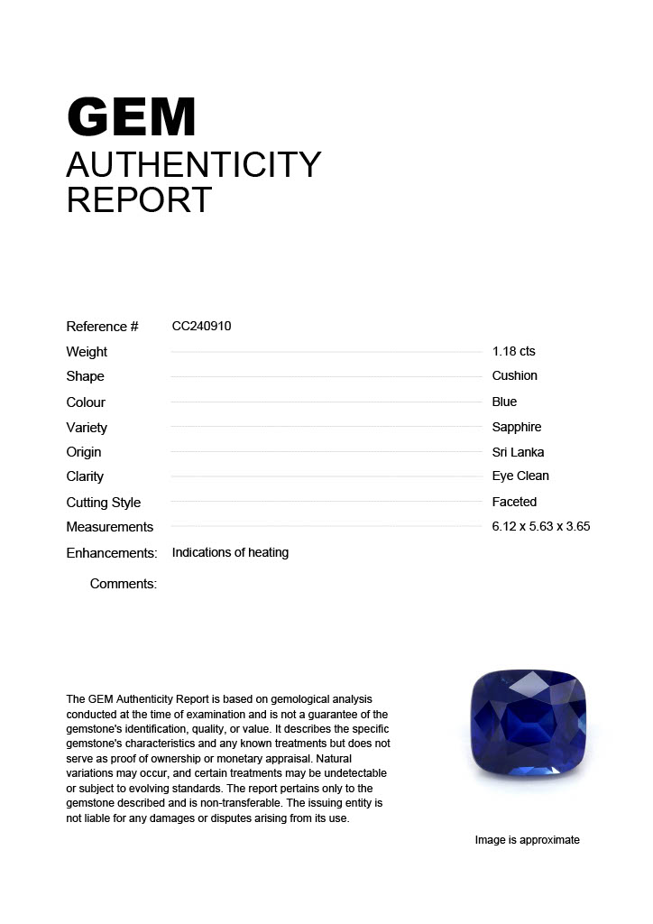 1.18ct Blue Cushion Sri Lanka SapphireCarat: 1.18 ctType: SapphireCut: CushionColour: BlueOrigin: Sri LankaComment: Heated6.12 x 5.63 x 3.65 mm