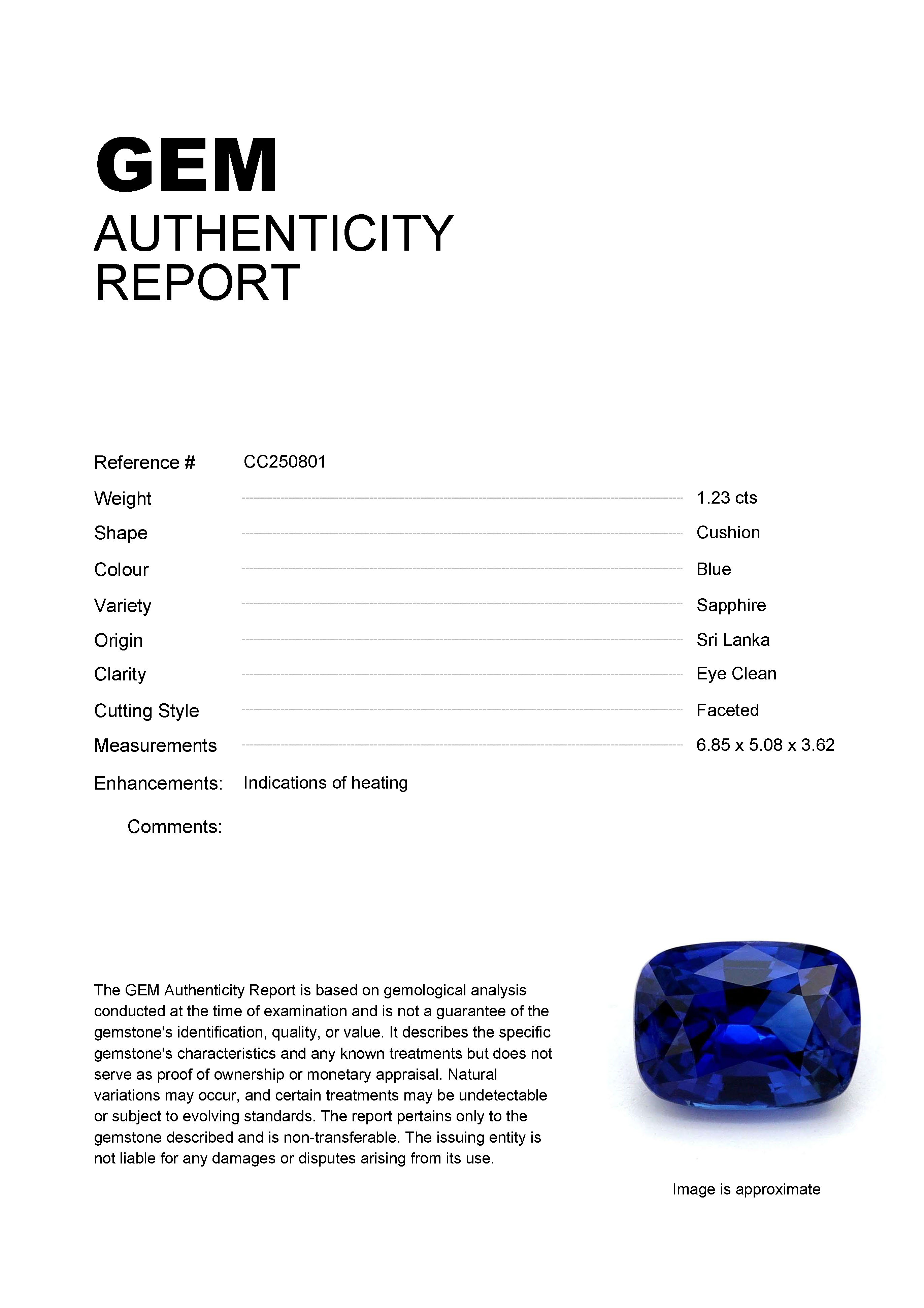 1.23ct Blue Cushion Sri Lanka SapphireCarat: 1.23 ctType: SapphireCut: CushionColour: BlueOrigin: Sri LankaComment: Heated6.85 x 5.08 x 3.62 mm