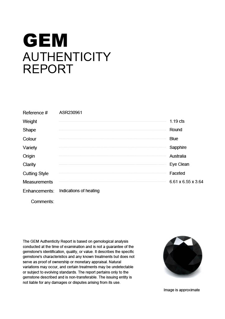 1.19ct Blue Round Australia SapphireCarat: 1.19 ctType: SapphireCut: RoundColour: BlueOrigin: AustraliaComment: Heated6.61 x 6.55 x 3.64 mm