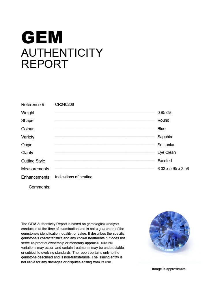 0.95ct Blue Round Sri Lanka SapphireCarat: 0.95 ctType: SapphireCut: RoundColour: BlueOrigin: Sri LankaComment: Heated6.03 x 5.95 x 3.58 mm