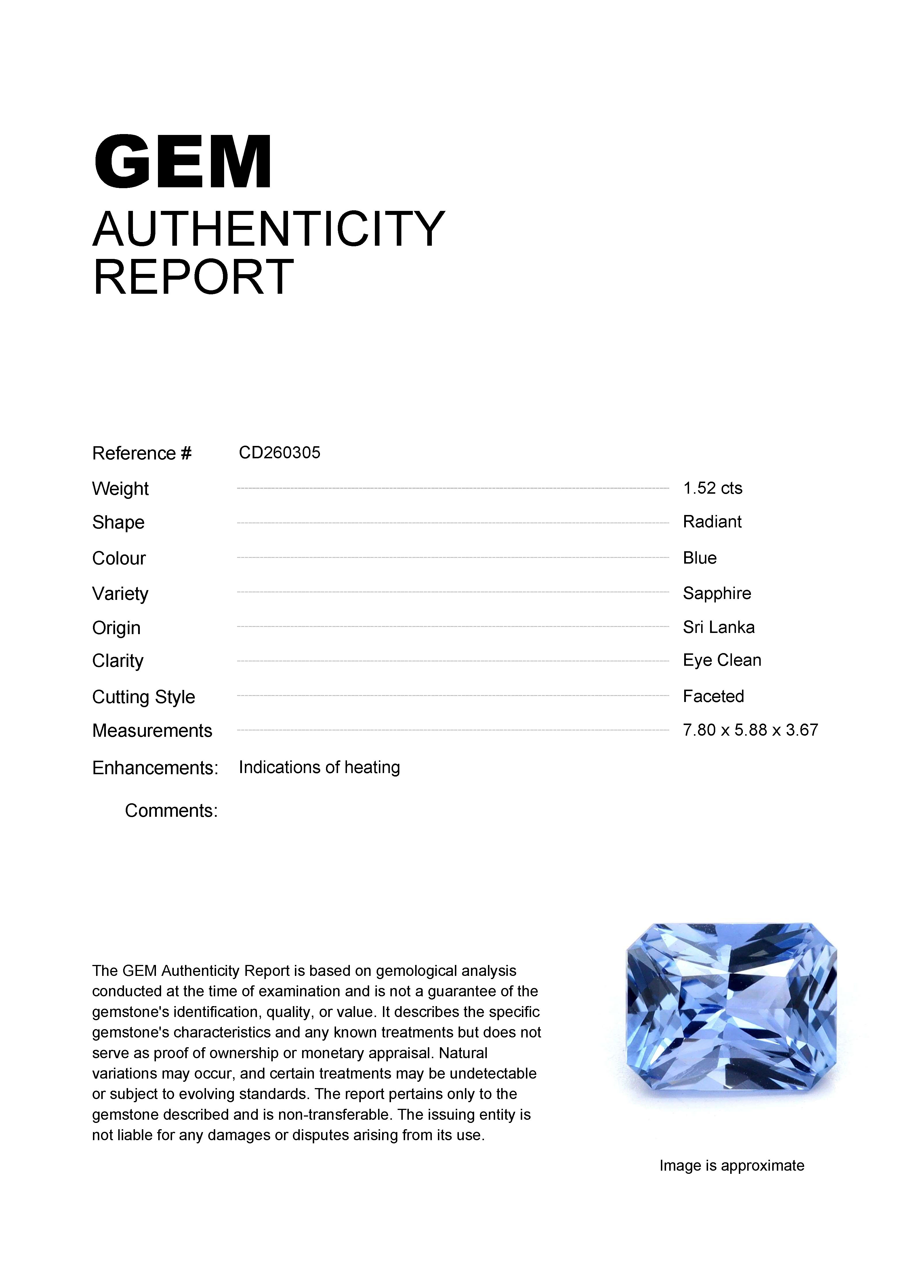 1.52ct Blue Radiant Sri Lanka SapphireCarat: 1.52 ctType: SapphireCut: RadiantColour: BlueOrigin: Sri LankaComment: Heated7.80 x 5.88 x 3.67 mm