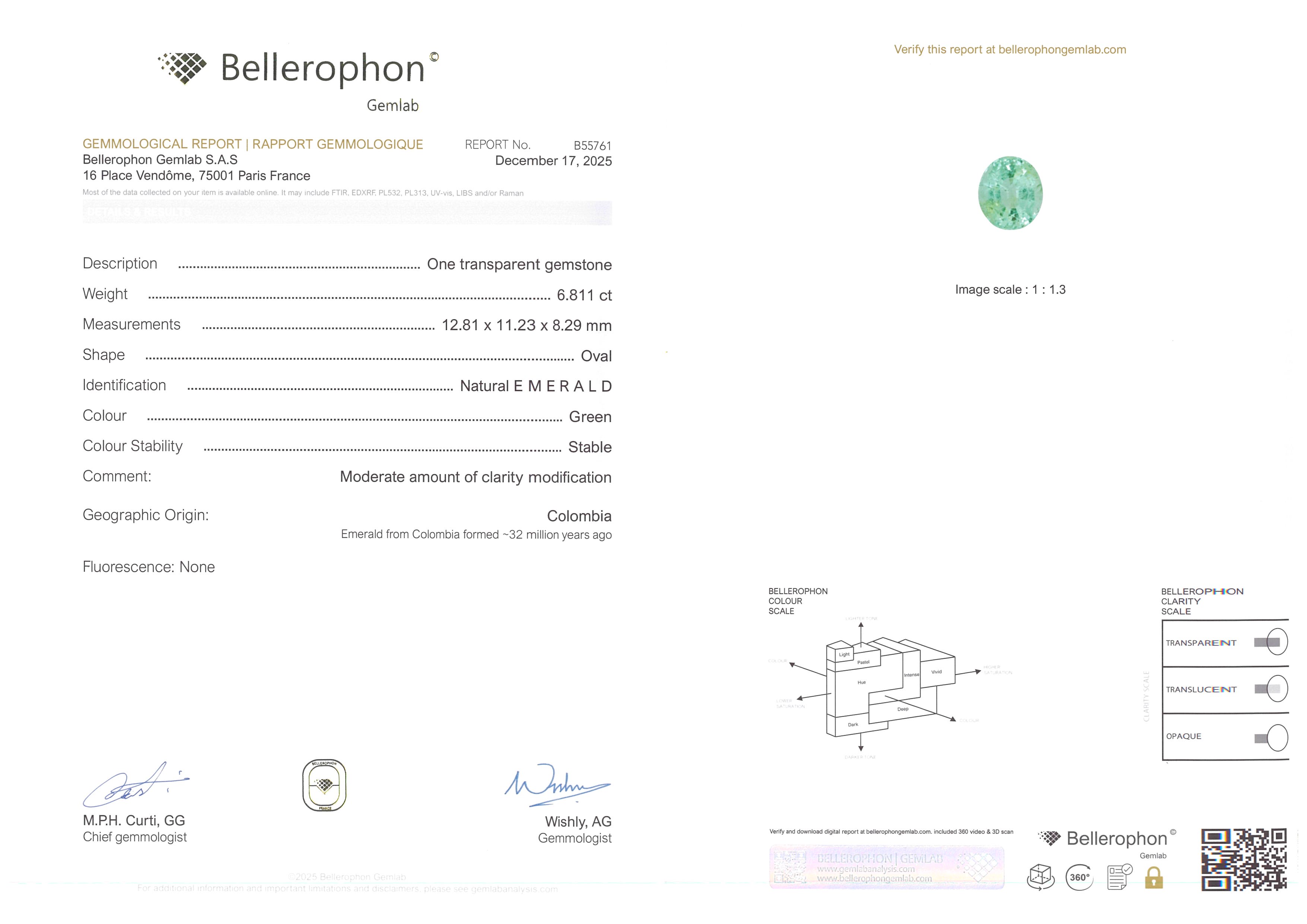 6.81ct Green Oval Colombia EmeraldCarat: 6.81 ctType: EmeraldCut: OvalColour: GreenOrigin: ColombiaComment: Not Heated,
