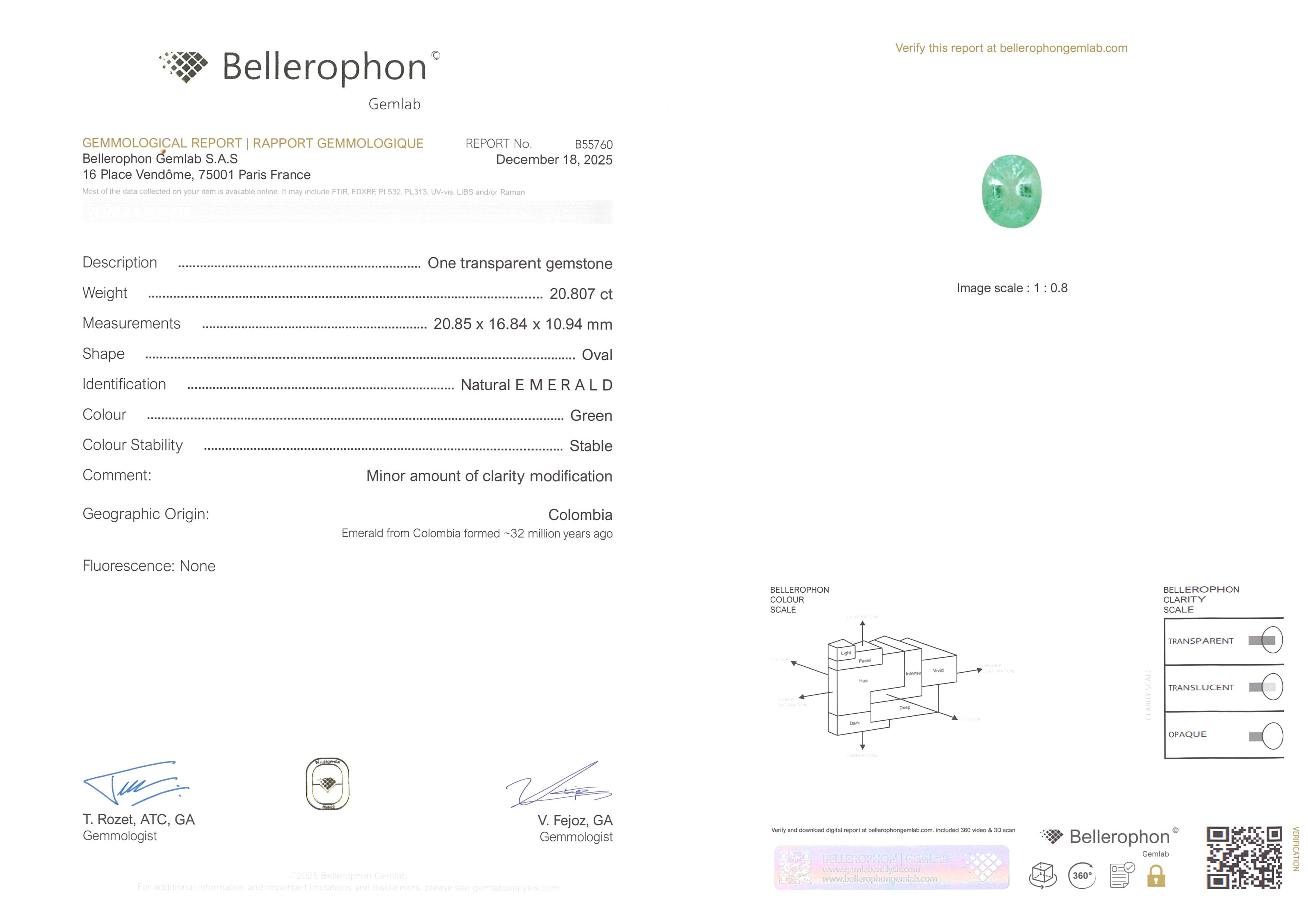 20.80ct Green Oval Colombia EmeraldCarat: 20.80 ctType: EmeraldCut: OvalColour: GreenOrigin: ColombiaComment: Not Heated,