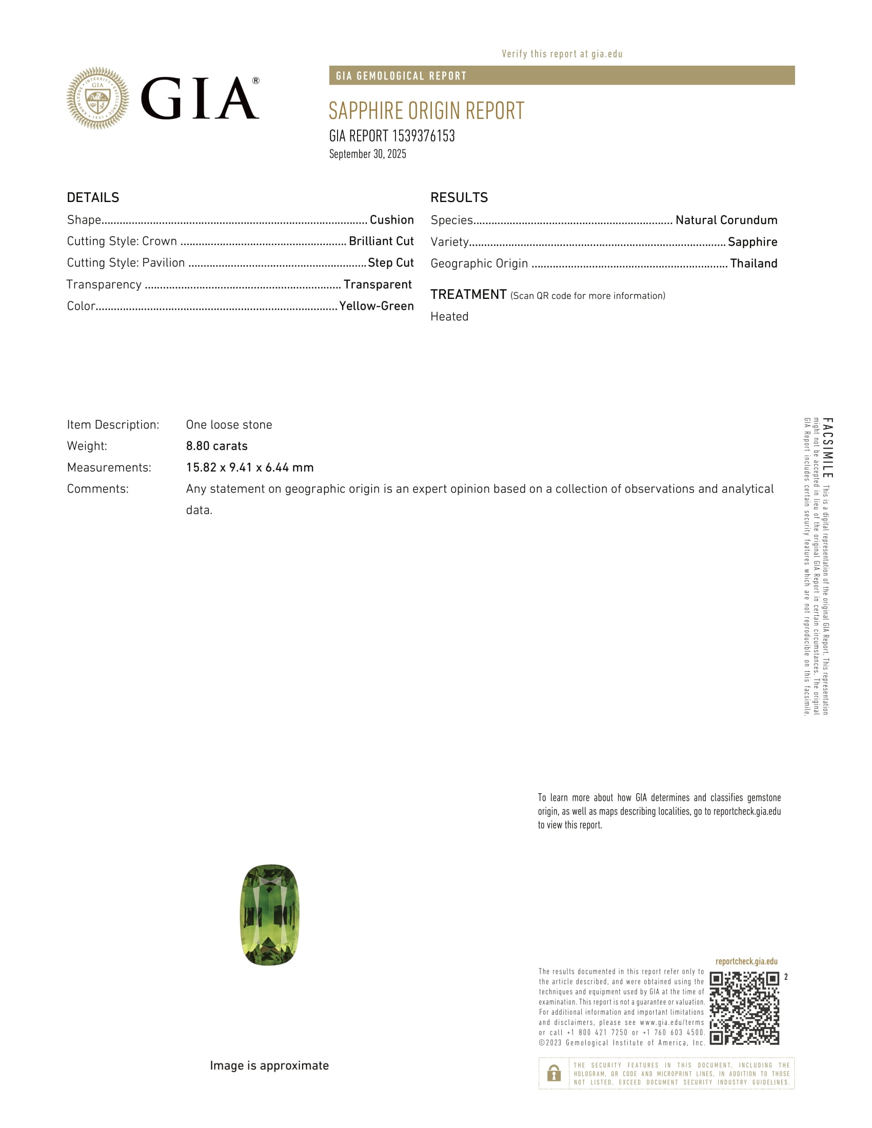GIA: 2507384168 Stock ID: ASC2308164.21ct Green Cushion Australia SapphireCarat: 4.21 ctType: SapphireCut: CushionColour: GreenOrigin: AustraliaComment: Heated10.93 x 8.81 x 5.55 mm