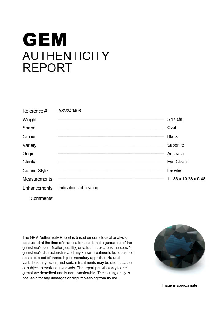 5.17ct Black Oval Australia SapphireCarat: 5.17 ctType: SapphireCut: OvalColour: BlackOrigin: AustraliaComment: Heated11.83 x 10.23 x 5.48 mm