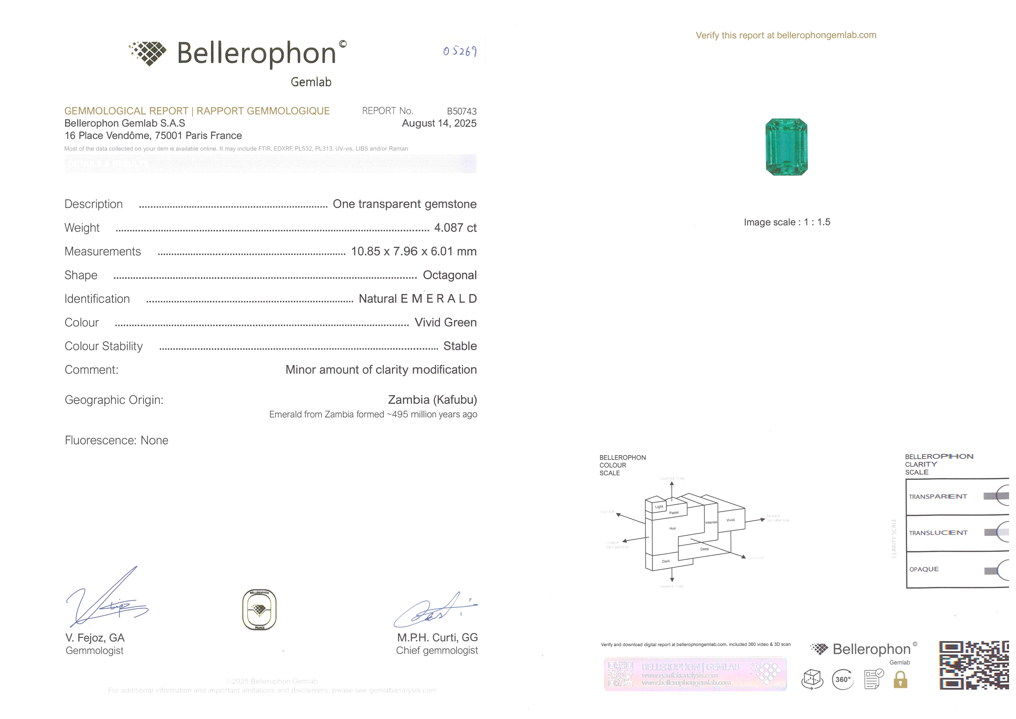 4.08ct Green Emerald Zambia EmeraldCarat: 4.08 ctType: EmeraldCut: EmeraldColour: GreenOrigin: ZambiaComment: Not Heated,
