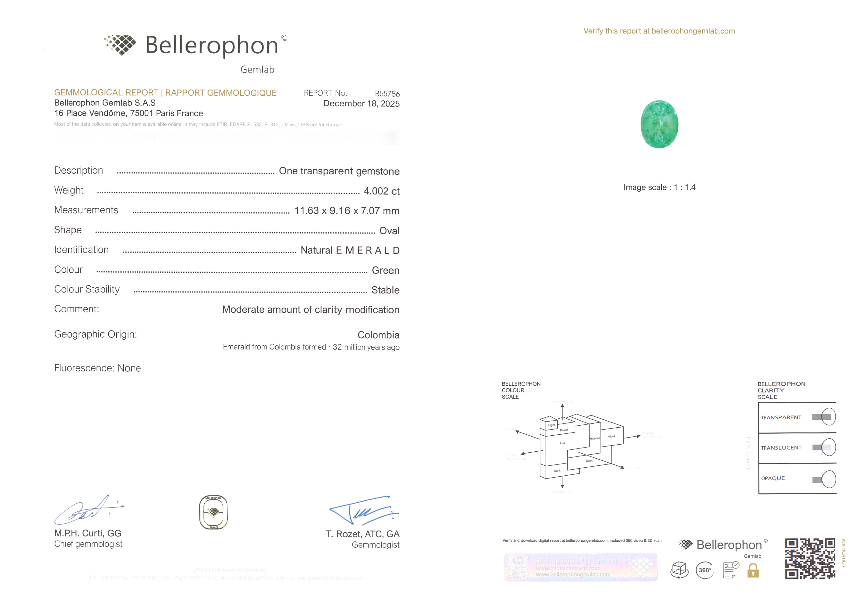 4.00ct Green Oval Colombia EmeraldCarat: 4.00 ctType: EmeraldCut: OvalColour: GreenOrigin: ColombiaComment: Not Heated,