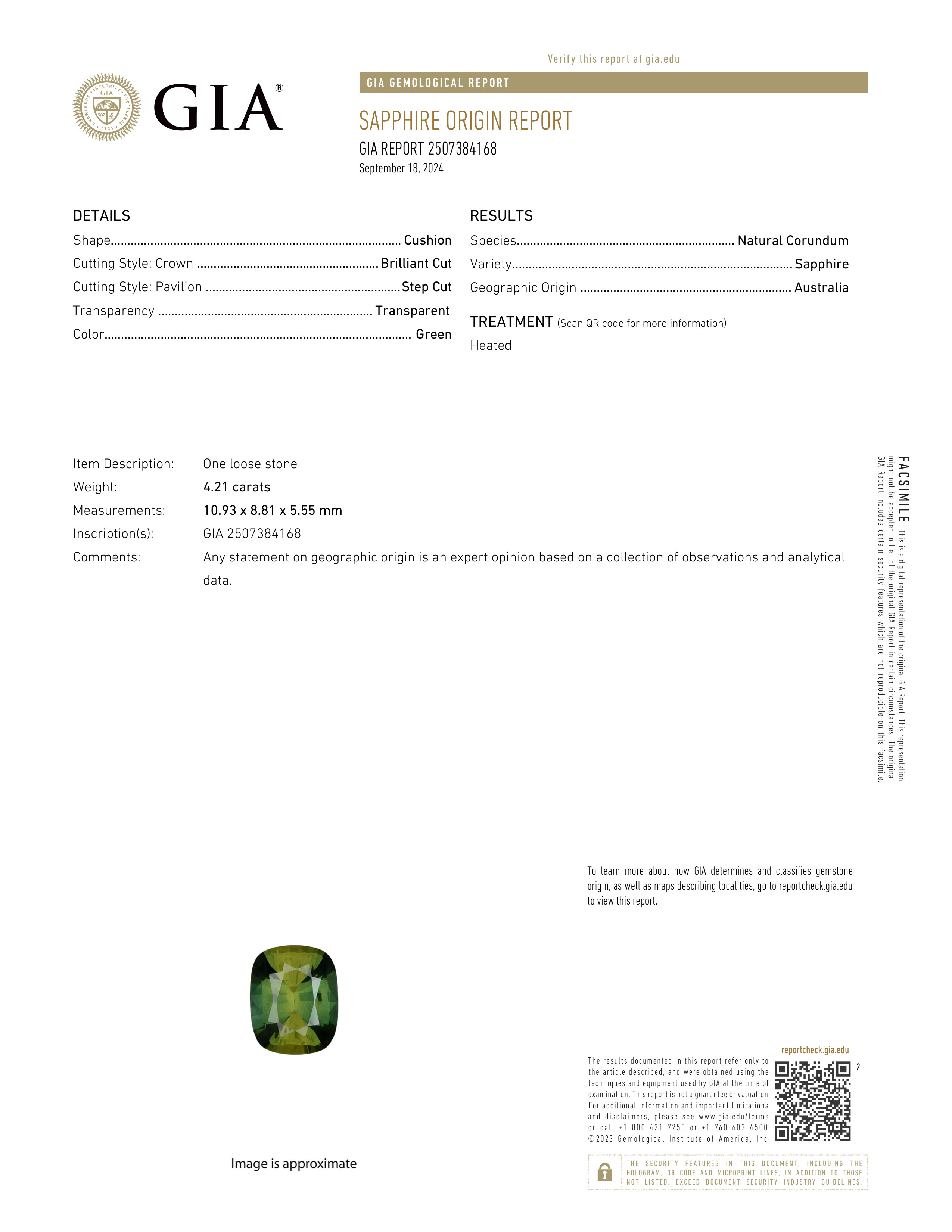 GIA: 2507384168 Stock ID: ASC2308164.21ct Green Cushion Australia SapphireCarat: 4.21 ctType: SapphireCut: CushionColour: GreenOrigin: AustraliaComment: Heated10.93 x 8.81 x 5.55 mm