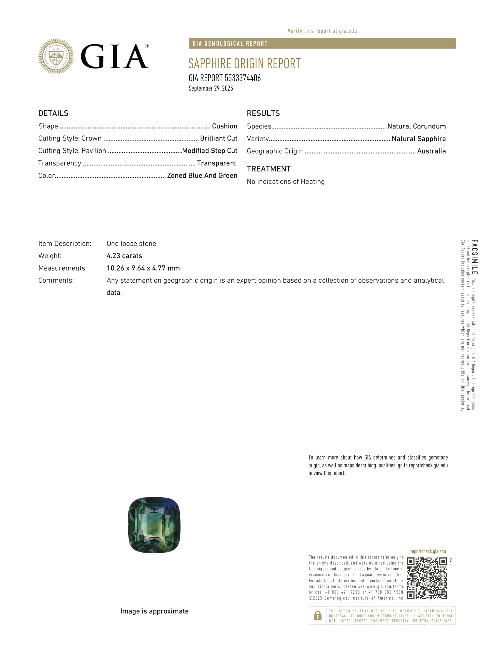 GIA: 5533374406 Stock ID: ASC2504074.23ct Parti Cushion Australia SapphireCarat: 4.23 ctType: SapphireCut: CushionColour: PartiOrigin: AustraliaComment: Not Heated10.26 x 9.64 x 4.77 mm
