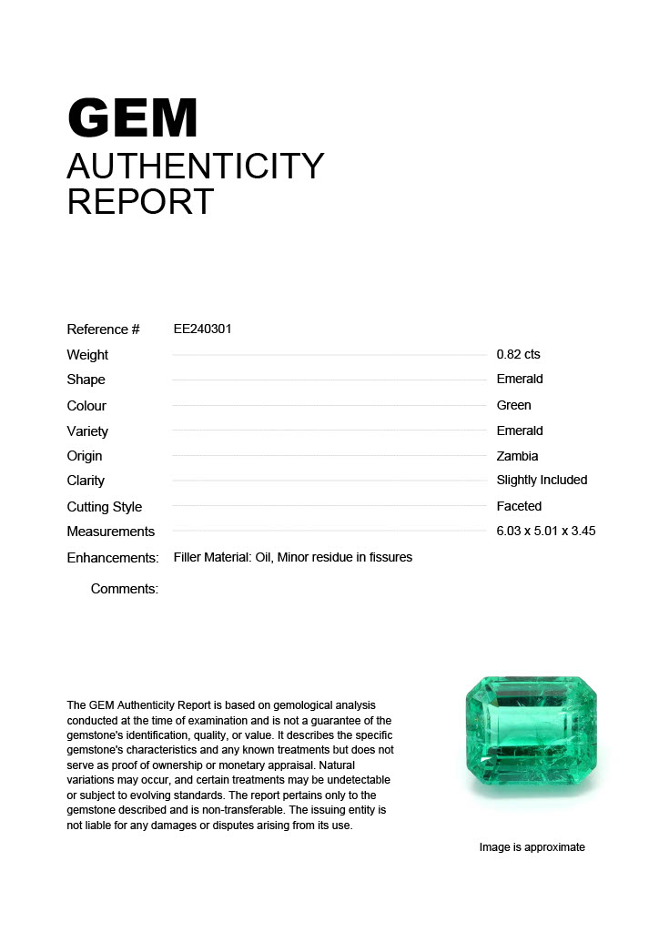 0.82ct Green Emerald Zambia EmeraldCarat: 0.82 ctType: EmeraldCut: EmeraldColour: GreenOrigin: ZambiaComment: Not Heated,
