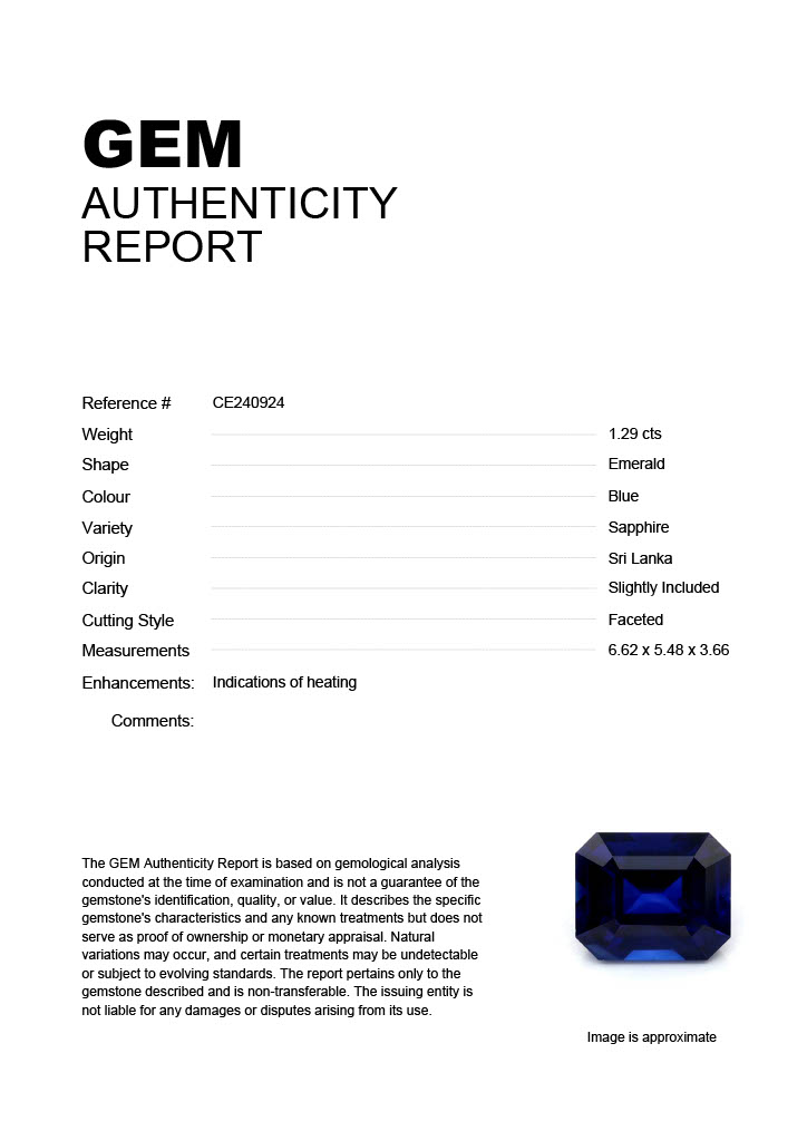 1.29ct Blue Emerald Sri Lanka SapphireCarat: 1.29 ctType: SapphireCut: EmeraldColour: BlueOrigin: Sri LankaComment: Heated6.62 x 5.48 x 3.66 mm