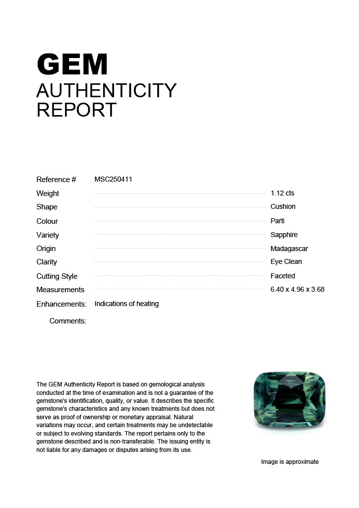 1.12ct Parti Cushion Madagascar SapphireCarat: 1.12 ctType: SapphireCut: CushionColour: PartiOrigin: MadagascarComment: Heated6.40 x 4.96 x 3.68 mm