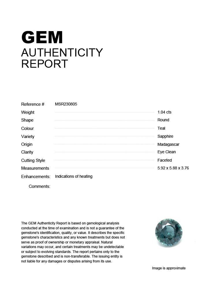 1.04ct Teal Round Madagascar SapphireCarat: 1.04 ctType: SapphireCut: RoundColour: TealOrigin: MadagascarComment: Heated5.92 x 5.88 x 3.76 mm