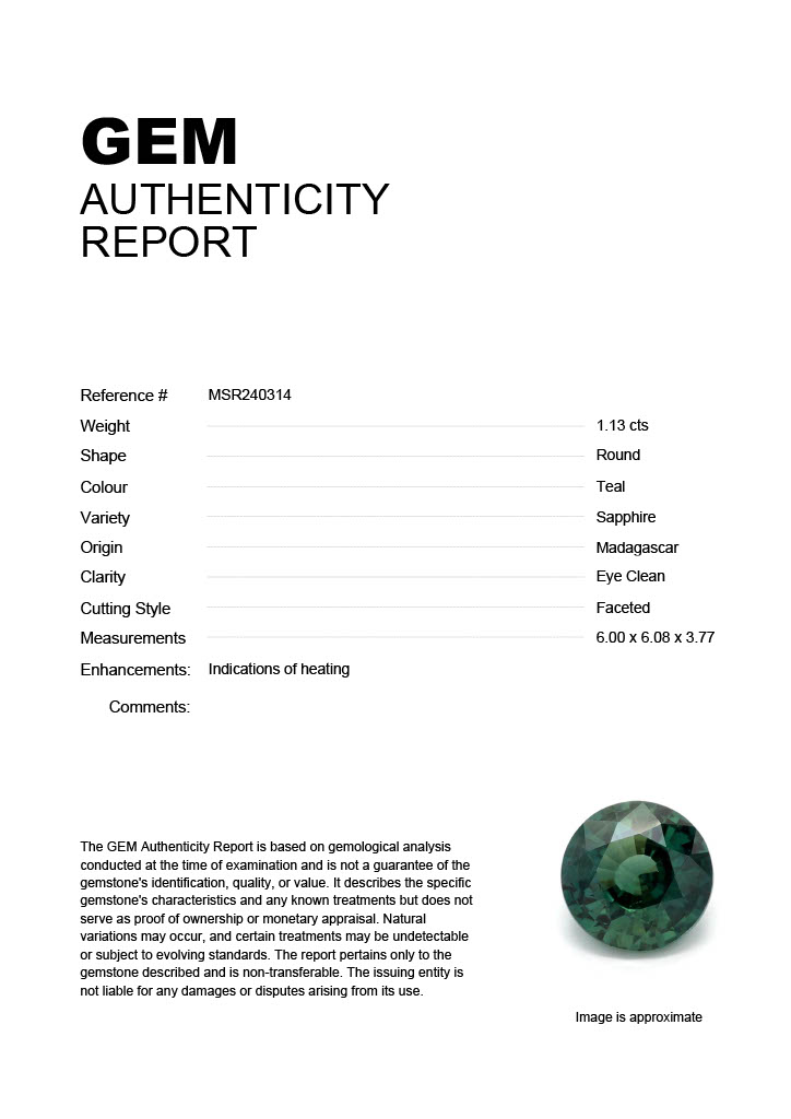 1.13ct Teal Round Madagascar SapphireCarat: 1.13 ctType: SapphireCut: RoundColour: TealOrigin: MadagascarComment: Heated6.00 x 6.08 x 3.77 mm