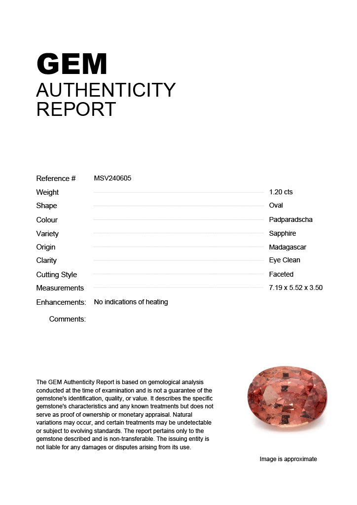 1.20ct Padparadscha Oval Madagascar SapphireCarat: 1.20 ctType: SapphireCut: OvalColour: PadparadschaOrigin: MadagascarComment: Not Heated7.19 x 5.52 x 3.50 mm