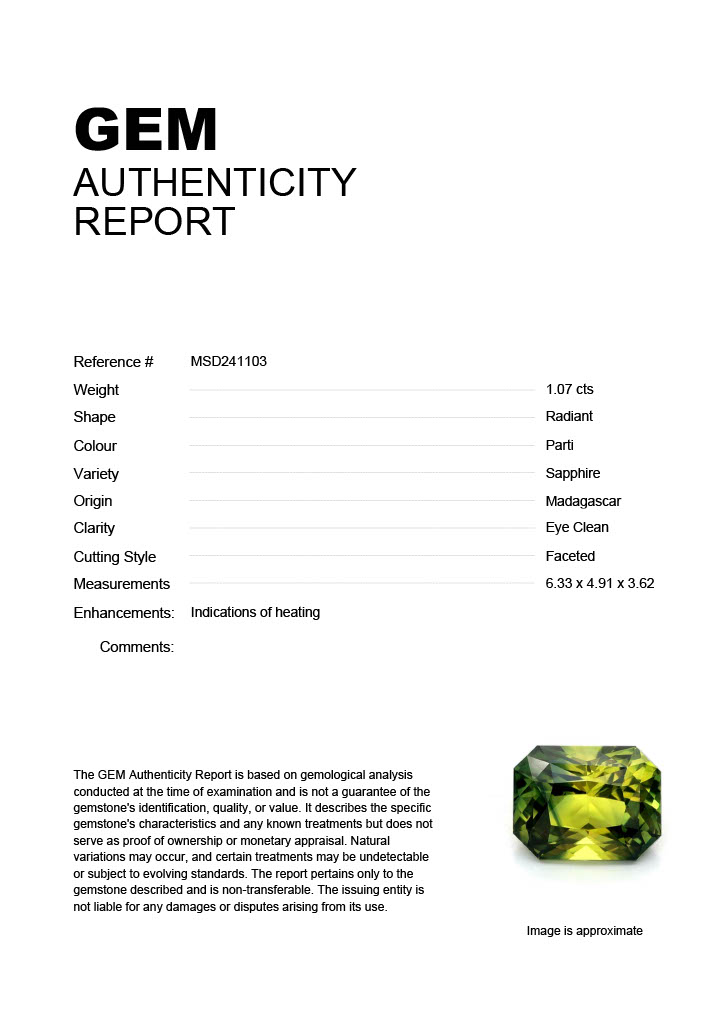 Stock ID: MSE2508051.06ct Parti Emerald Madagascar SapphireCarat: 1.06 ctType: SapphireCut: EmeraldColour: PartiOrigin: MadagascarComment: Heated6.28 x 5.27 x 3.03 mm