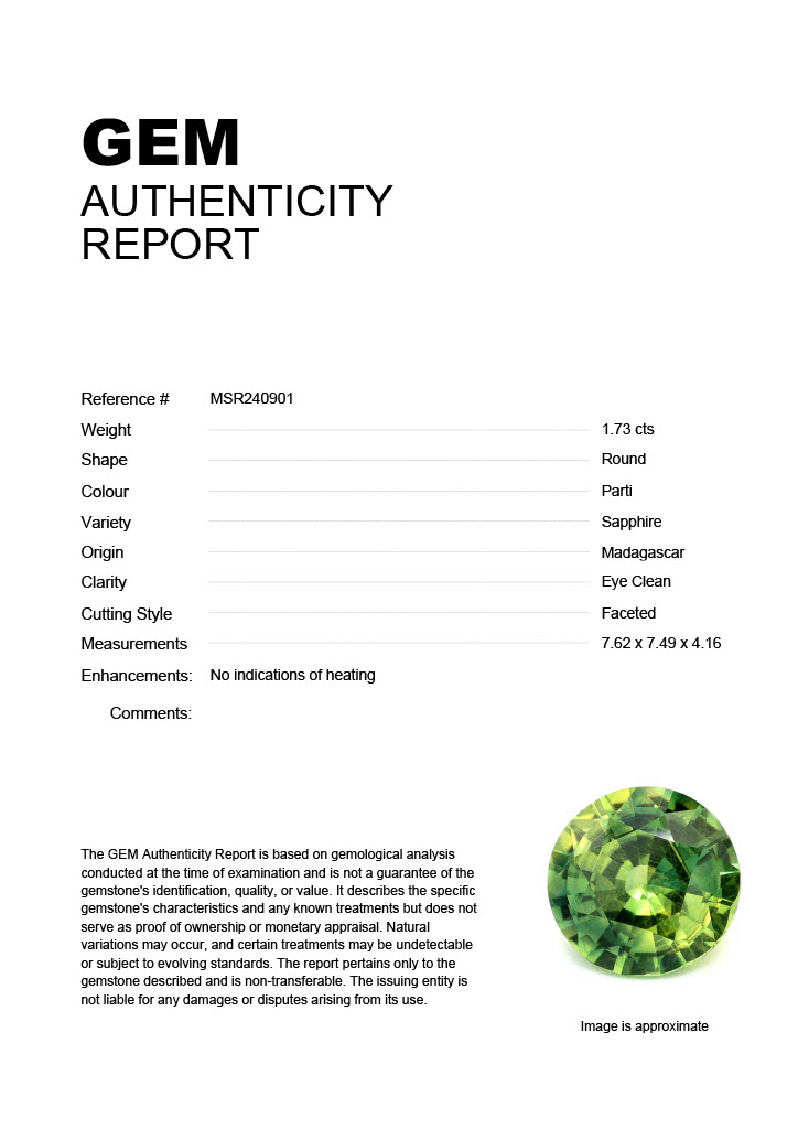 1.73ct Parti Round Madagascar SapphireCarat: 1.73 ctType: SapphireCut: RoundColour: PartiOrigin: MadagascarComment: Not Heated7.62 x 7.49 x 4.16 mm