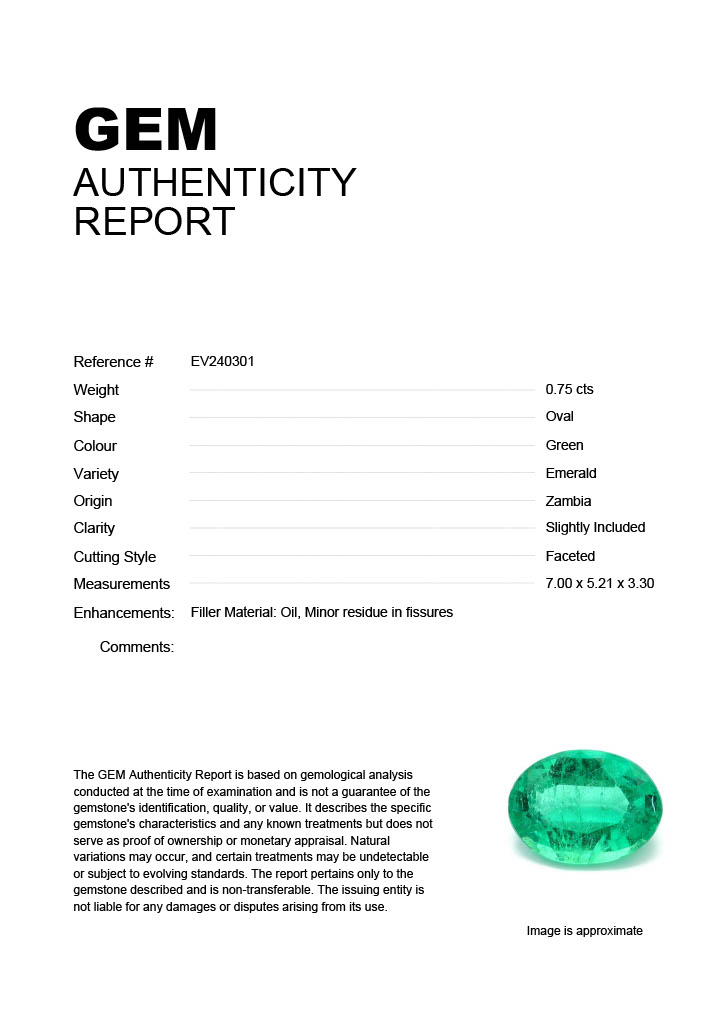 0.75ct Green Oval Zambia EmeraldCarat: 0.75 ctType: EmeraldCut: OvalColour: GreenOrigin: ZambiaComment: Not Heated,