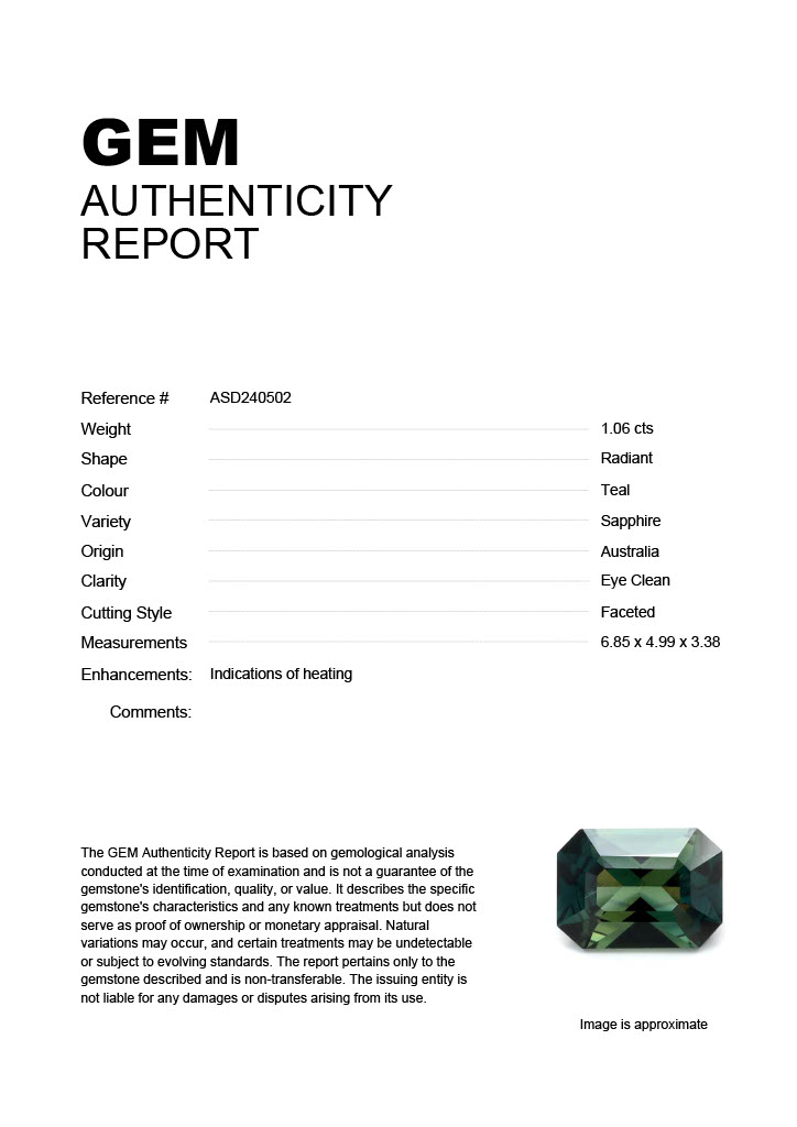 No certificate Stock ID: ASD2308051.04ct Teal Radiant Australia SapphireCarat: 1.04 ctType: SapphireCut: RadiantColour: TealOrigin: AustraliaComment: Heated6.47 x 5.18 x 3.33 mm