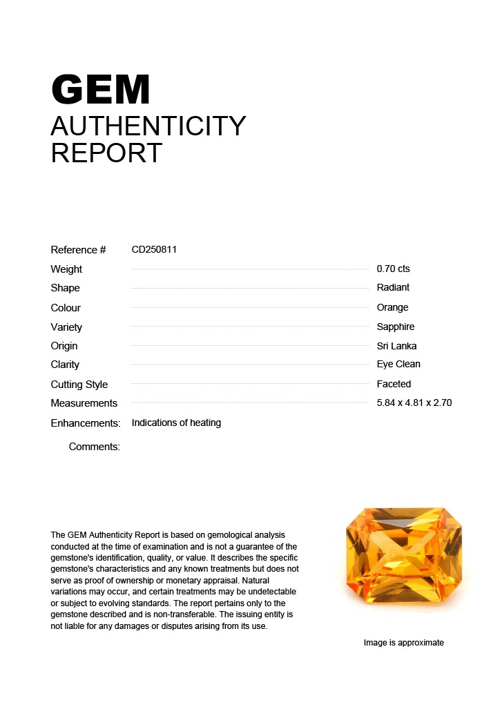 0.70ct Orange Radiant Sri Lanka SapphireCarat: 0.70 ctType: SapphireCut: RadiantColour: OrangeOrigin: Sri LankaComment: Heated5.84 x 4.81 x 2.70 mm