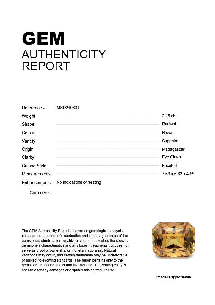 2.15ct Brown Radiant Madagascar SapphireCarat: 2.15 ctType: SapphireCut: RadiantColour: BrownOrigin: MadagascarComment: Not Heated7.63 x 6.32 x 4.59 mm