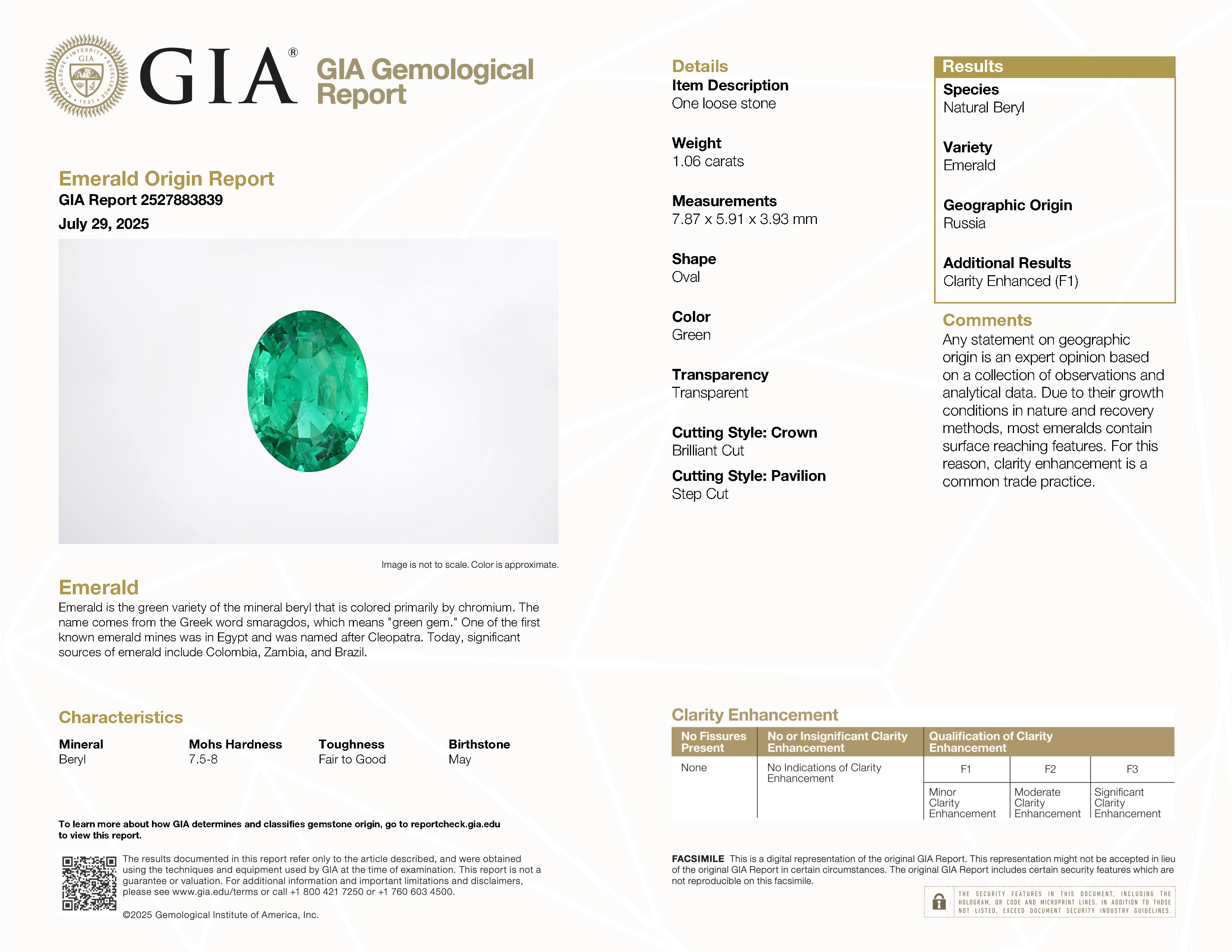 GIA: 2527883839 Stock ID: EV2403111.06ct Green Oval Russia EmeraldCarat: 1.06 ctType: EmeraldCut: OvalColour: GreenOrigin: RussiaComment: Not Heated,