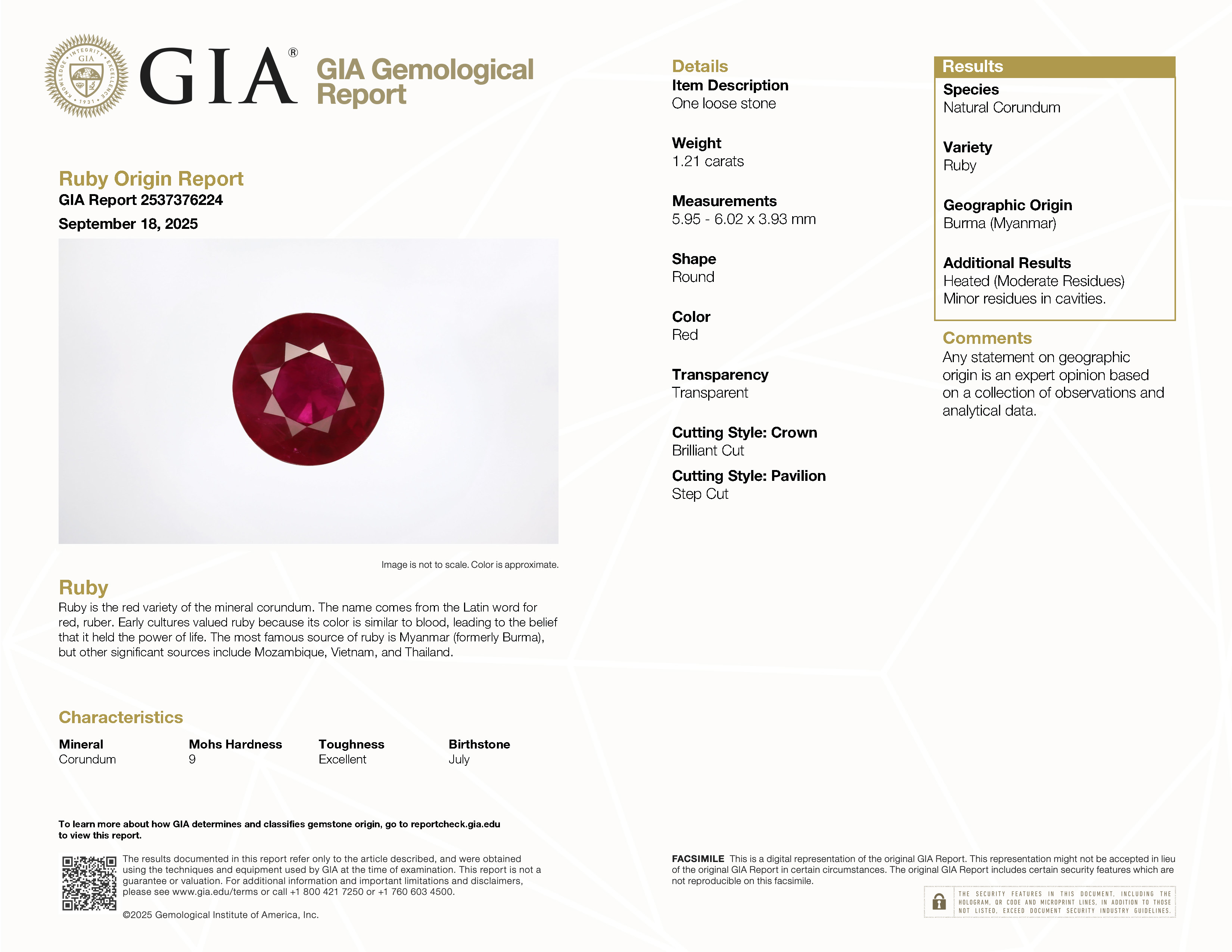 GIA: 2537376224 Stock ID: RR2403031.21ct Red Round Myanmar (Burma) RubyCarat: 1.21 ctType: RubyCut: RoundColour: RedOrigin: Myanmar (Burma)Comment: Heated6.02 x 5.95 x 3.93 mm