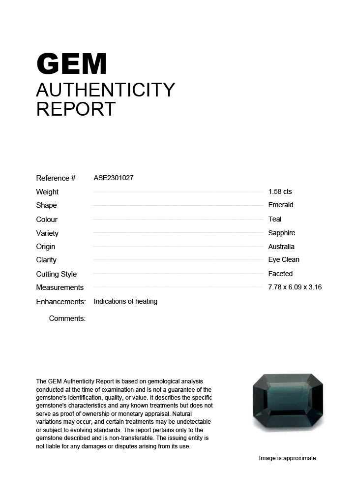 GEM: ASE2301027 Stock ID: ASE23010271.58ct Teal Emerald Australia SapphireCarat: 1.58 ctType: SapphireCut: EmeraldColour: TealOrigin: AustraliaComment: Heated7.78 x 6.09 x 3.16 mm