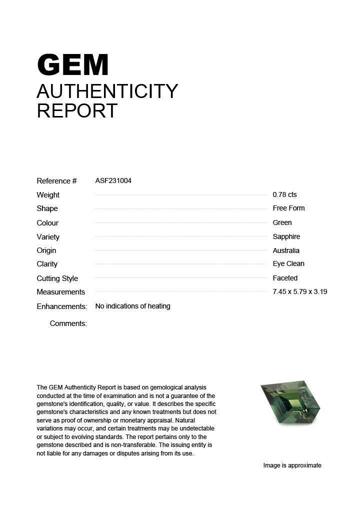 0.78ct Green Other Australia SapphireCarat: 0.78 ctType: SapphireCut: OtherColour: GreenOrigin: AustraliaComment: Not Heated7.45 x 5.79 x 3.19 mm