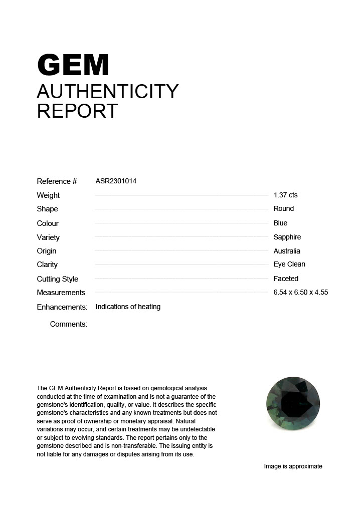GEM: ASR2301014 Stock ID: ASR23010141.37ct Blue Round Australia SapphireCarat: 1.37 ctType: SapphireCut: RoundColour: BlueOrigin: AustraliaComment: Heated6.54 x 6.50 x 4.55 mm