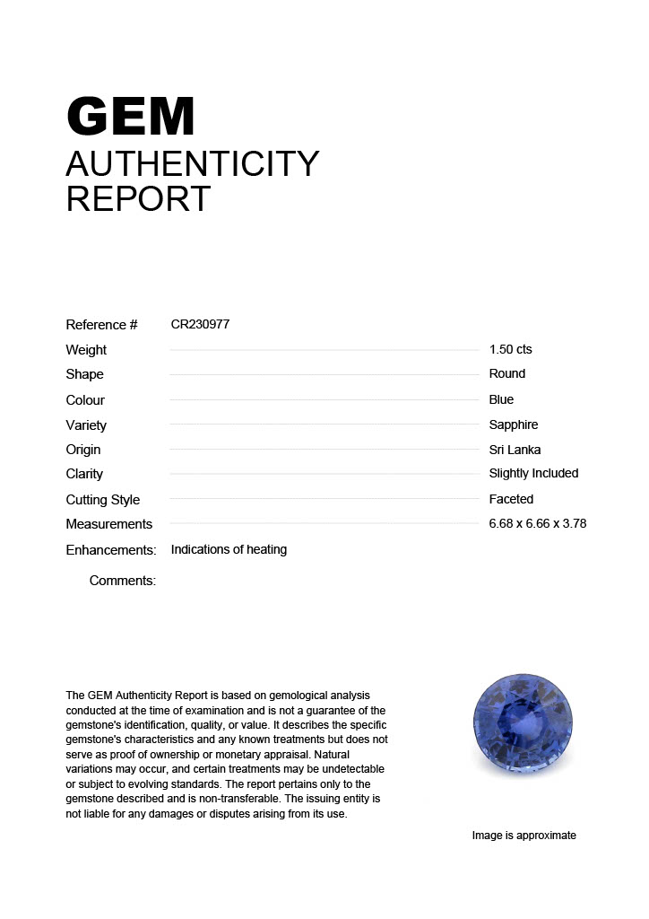 1.50ct Blue Round Sri Lanka SapphireCarat: 1.50 ctType: SapphireCut: RoundColour: BlueOrigin: Sri LankaComment: Heated6.68 x 6.66 x 3.78 mm