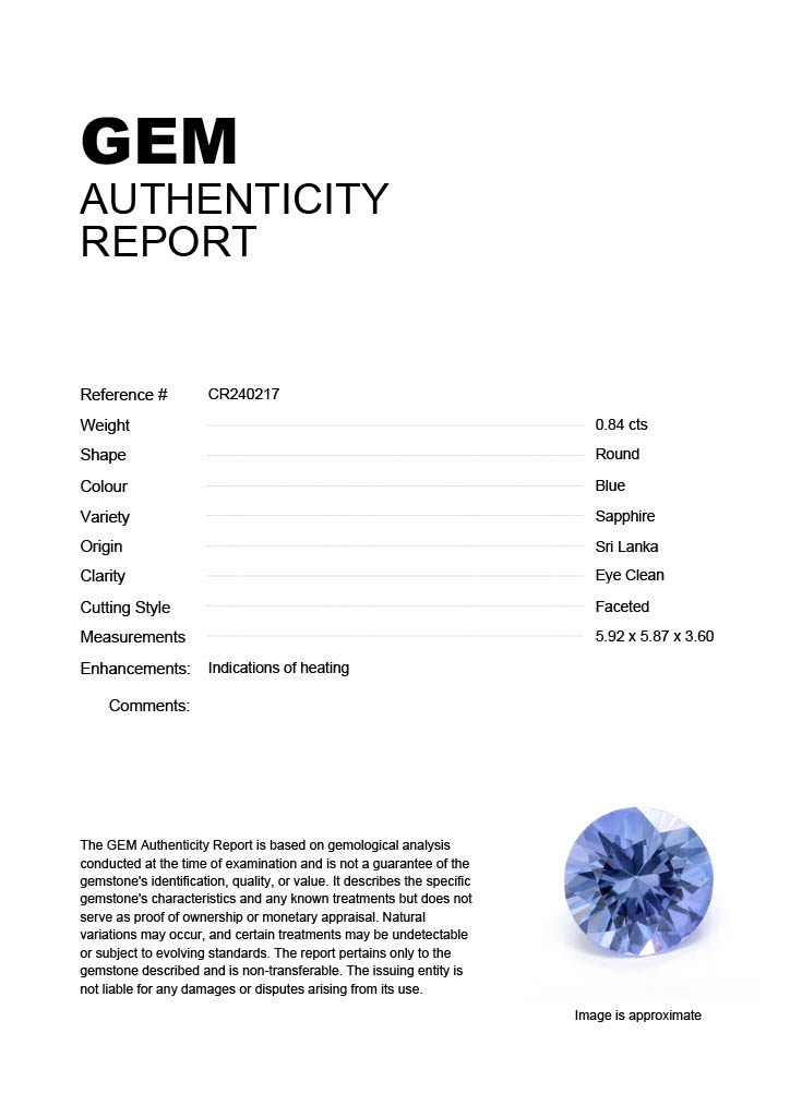 0.84ct Blue Round Sri Lanka SapphireCarat: 0.84 ctType: SapphireCut: RoundColour: BlueOrigin: Sri LankaComment: Heated5.92 x 5.87 x 3.60 mm