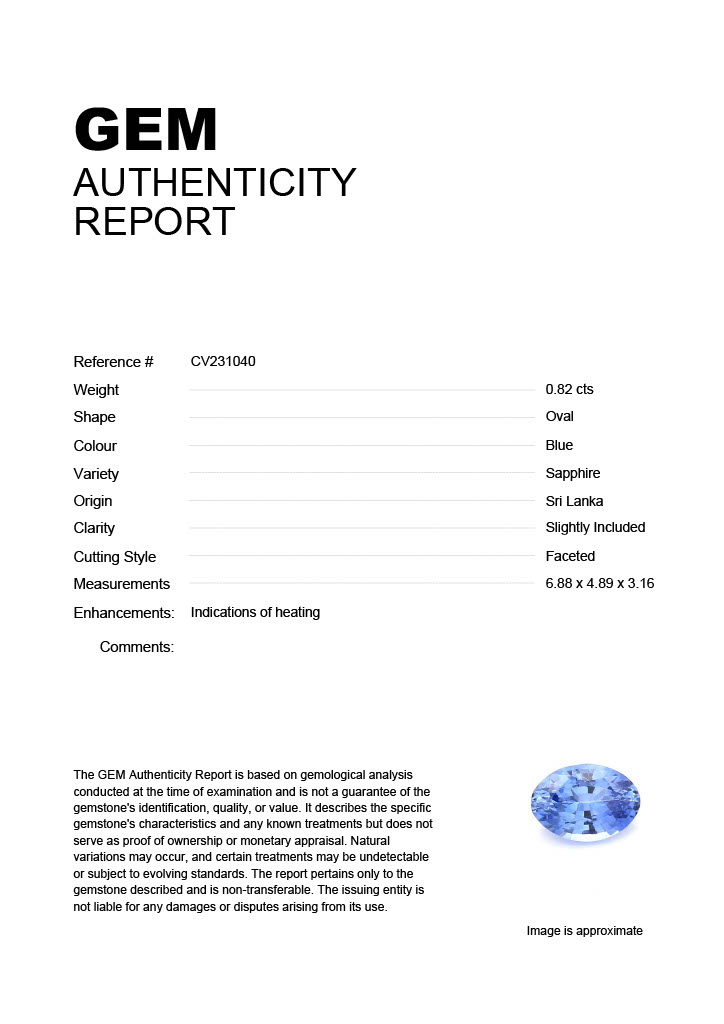0.82ct Blue Oval Sri Lanka SapphireCarat: 0.82 ctType: SapphireCut: OvalColour: BlueOrigin: Sri LankaComment: Heated6.88 x 4.89 x 3.16 mm