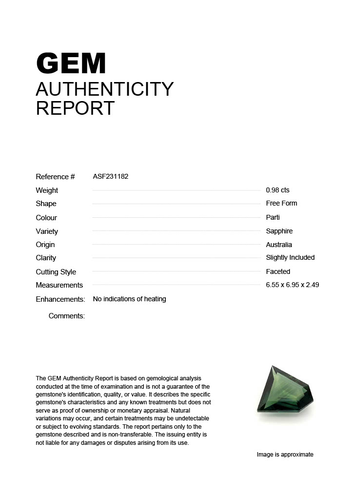 0.98ct Parti Other Australia SapphireCarat: 0.98 ctType: SapphireCut: OtherColour: PartiOrigin: AustraliaComment: Not Heated6.55 x 6.95 x 2.49 mm