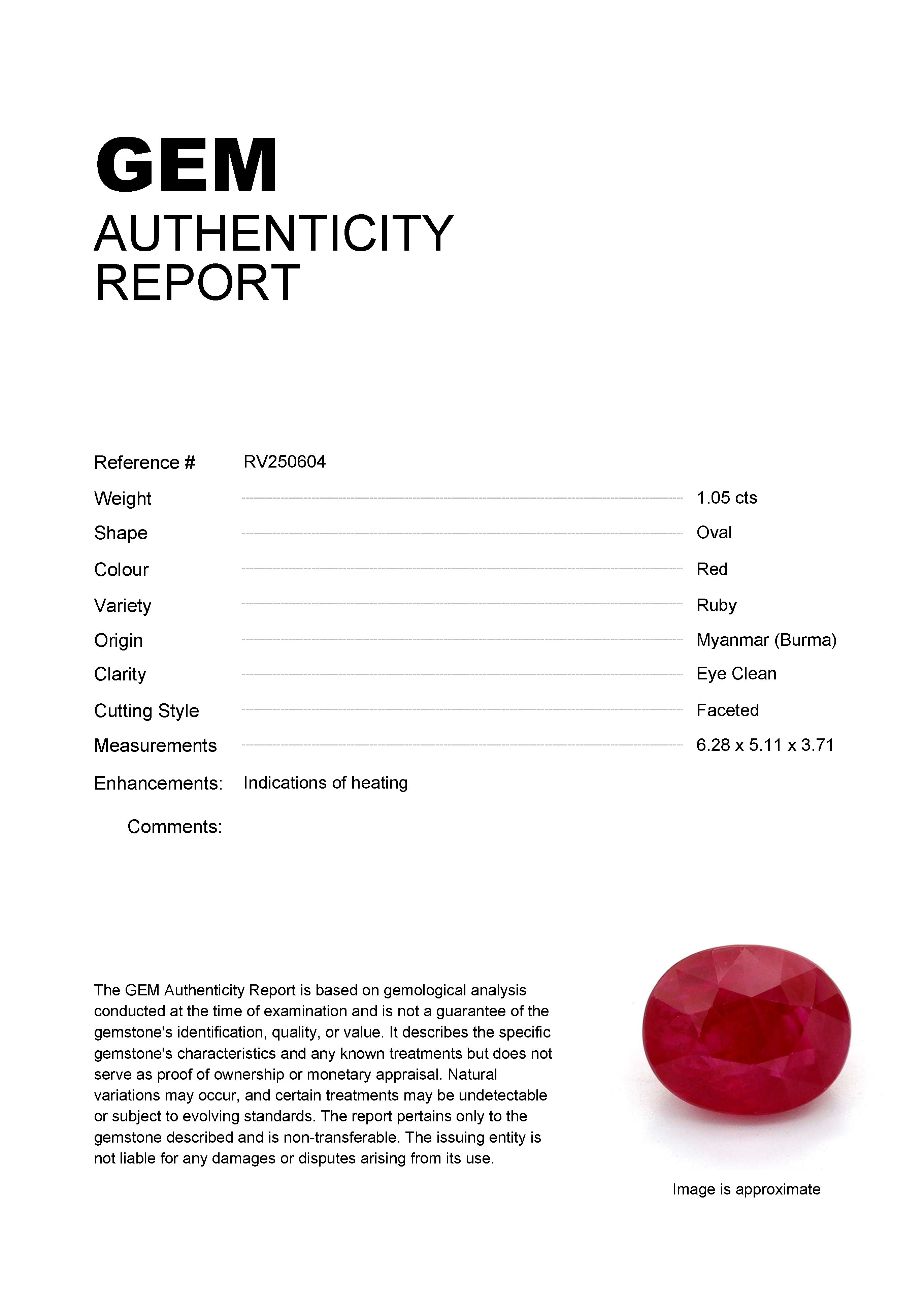 1.05ct Red Oval Myanmar (Burma) RubyCarat: 1.05 ctType: RubyCut: OvalColour: RedOrigin: Myanmar (Burma)Comment: Heated6.28 x 5.11 x 3.71 mm