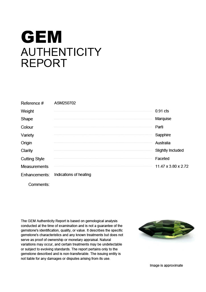 0.91ct Parti Marquise Australia SapphireCarat: 0.91 ctType: SapphireCut: MarquiseColour: PartiOrigin: AustraliaComment: Heated11.47 x 3.80 x 2.72 mm
