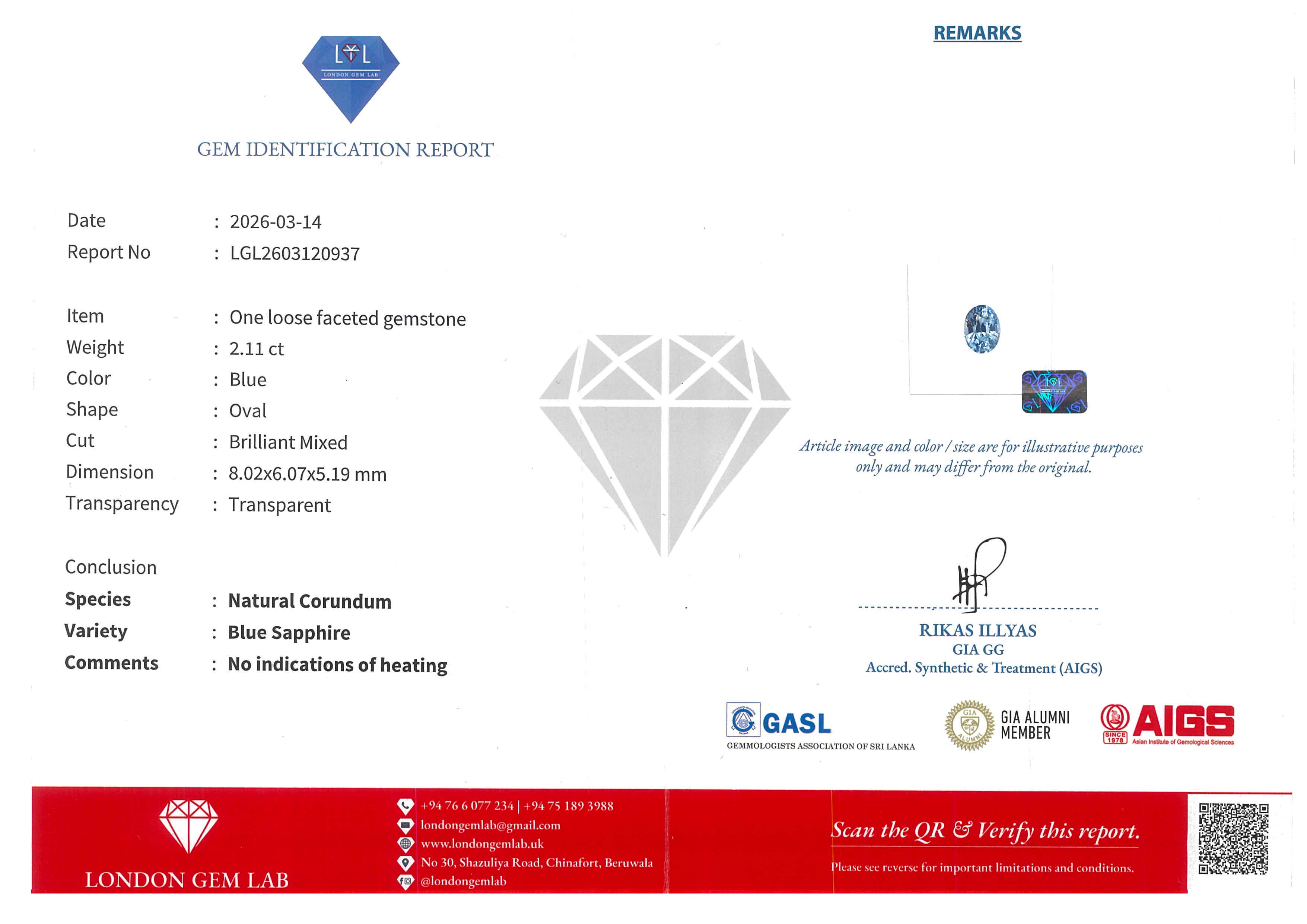 LGL: LGL2603120937 Stock ID: MSV2603412.11ct Blue Oval Madagascar SapphireCarat: 2.11 ctType: SapphireCut: OvalColour: BlueOrigin: MadagascarComment: Not Heated8.02 x 6.07 x 5.19 mm