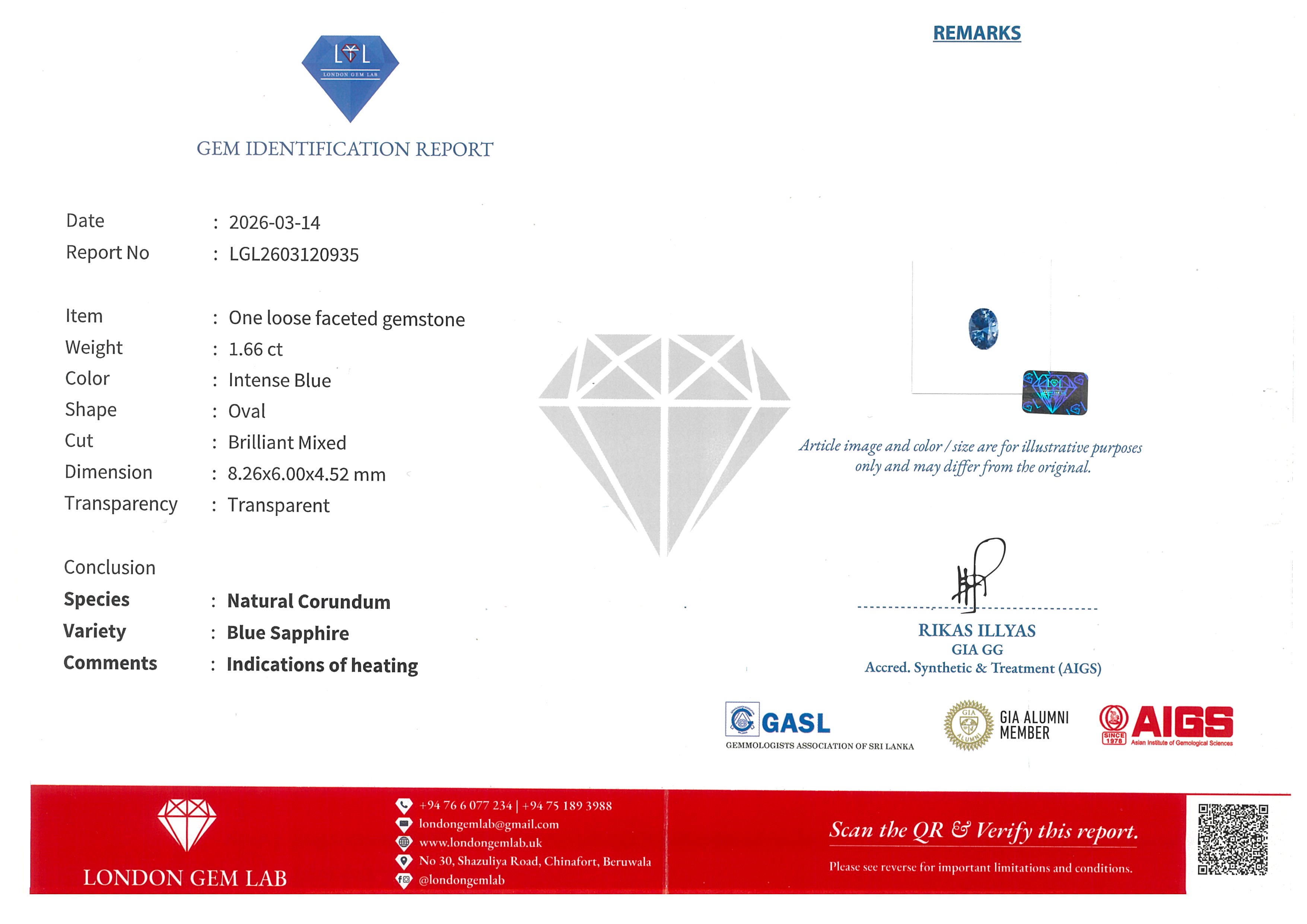 LGL: LGL2603120935 Stock ID: MSV2603381.66ct Blue Oval Madagascar SapphireCarat: 1.66 ctType: SapphireCut: OvalColour: BlueOrigin: MadagascarComment: Heated8.26 x 6.00 x 4.52 mm