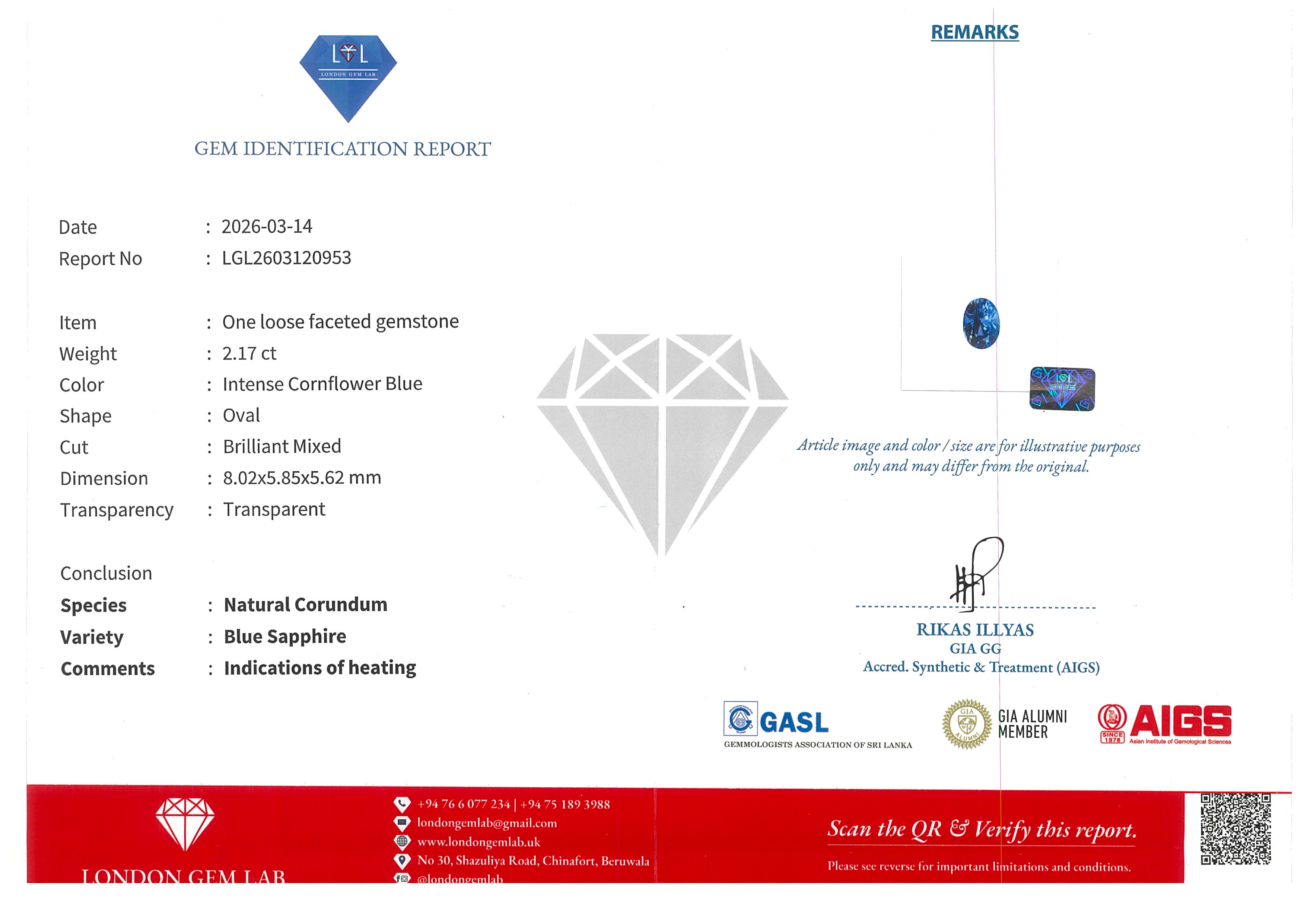 LGL: LGL2603120953 Stock ID: MSV2603372.17ct Blue Oval Madagascar SapphireCarat: 2.17 ctType: SapphireCut: OvalColour: BlueOrigin: MadagascarComment: Heated8.02 x 5.85 x 5.62 mm