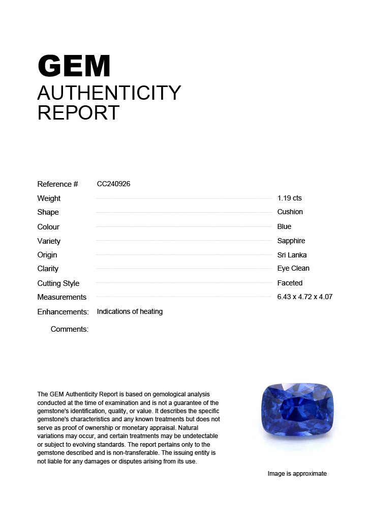 1.19ct Blue Cushion Sri Lanka SapphireCarat: 1.19 ctType: SapphireCut: CushionColour: BlueOrigin: Sri LankaComment: Heated6.43 x 4.72 x 4.07 mm