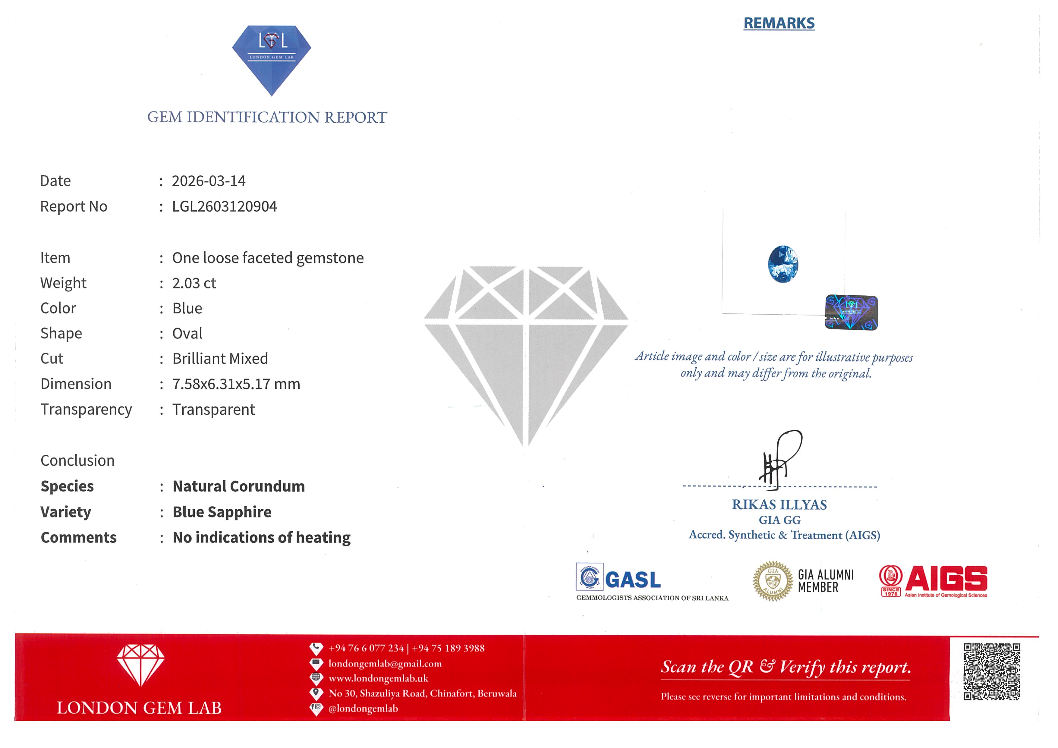 LGL: LGL2603120904 Stock ID: MSV2603402.03ct Blue Oval Madagascar SapphireCarat: 2.03 ctType: SapphireCut: OvalColour: BlueOrigin: MadagascarComment: Not Heated7.58 x 6.31 x 5.17 mm